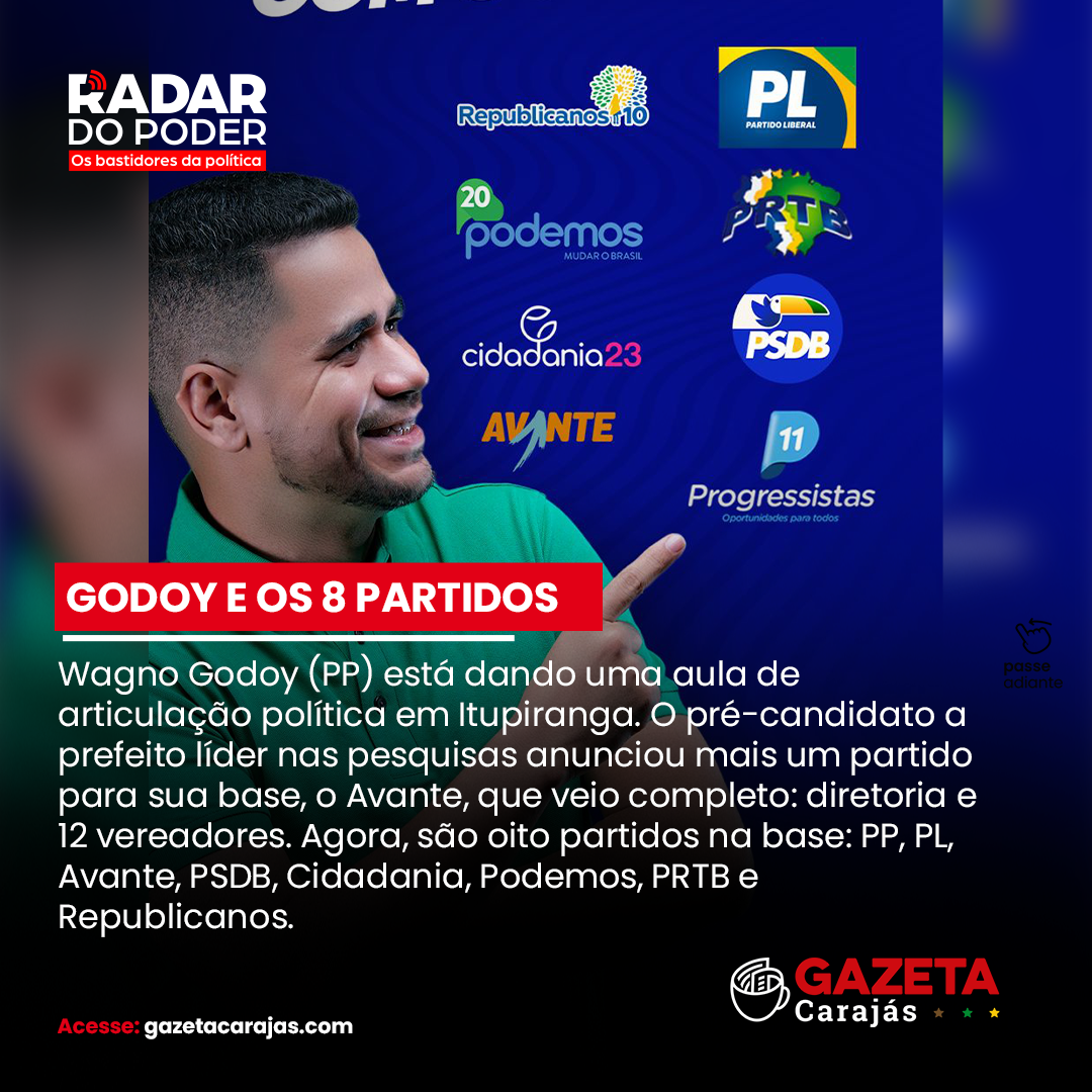 Wagno Godoy (PP) está dando uma aula de articulação política em Itupiranga. O pré-candidato a prefeito líder nas pesquisas anunciou mais um partido para sua base, o Avante, que veio completo: diretoria e 12 vereadores. Agora, são oito partidos na base: PP, PL, Avante, PSDB, Cidadania, Podemos, PRTB e Republicanos.