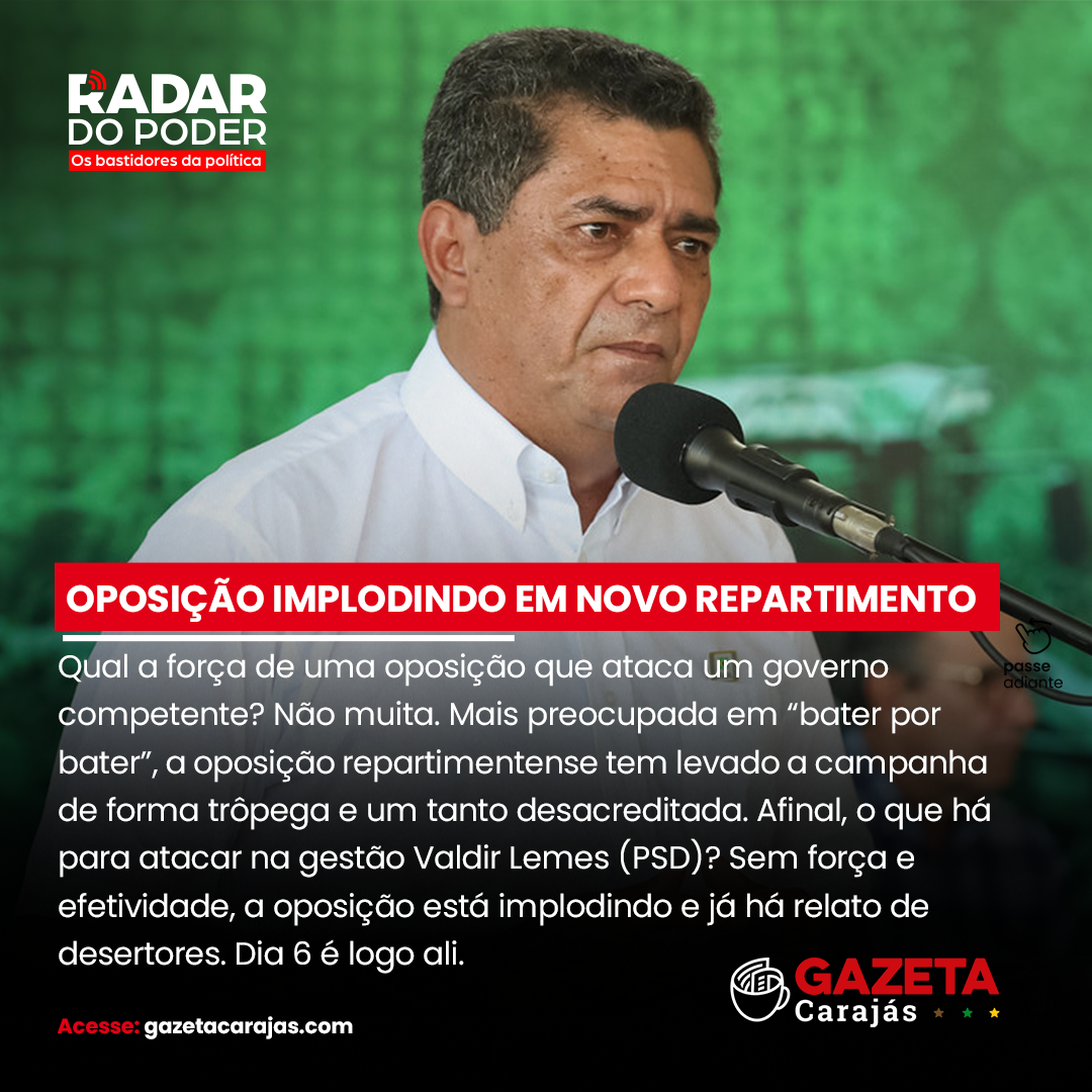 Qual a força de uma oposição que ataca um governo competente? Não muita. Mais preocupada em “bater por bater”, a oposição repartimentense tem levado a campanha de forma trôpega e um tanto desacreditada. Afinal, o que há para atacar na gestão Valdir Lemes (PSD). Sem força e efetividade, a oposição está implodindo e já há relato de desertores. Dia 6 é logo ali.