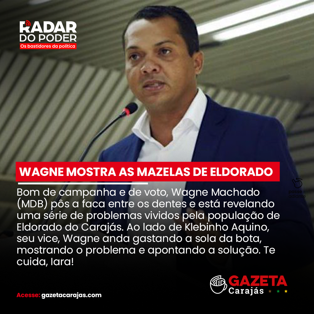 Bom de campanha e de voto, Wagne Machado (MDB) pôs a faca entre os dentes e está revelando uma série de problemas vividos pela população de Eldorado do Carajás. Ao lado de Klebinho Aquino, seu vice, Wagne anda gastando a sola da bota, mostrando o problema e apontando a solução. Te cuida, Iara!
