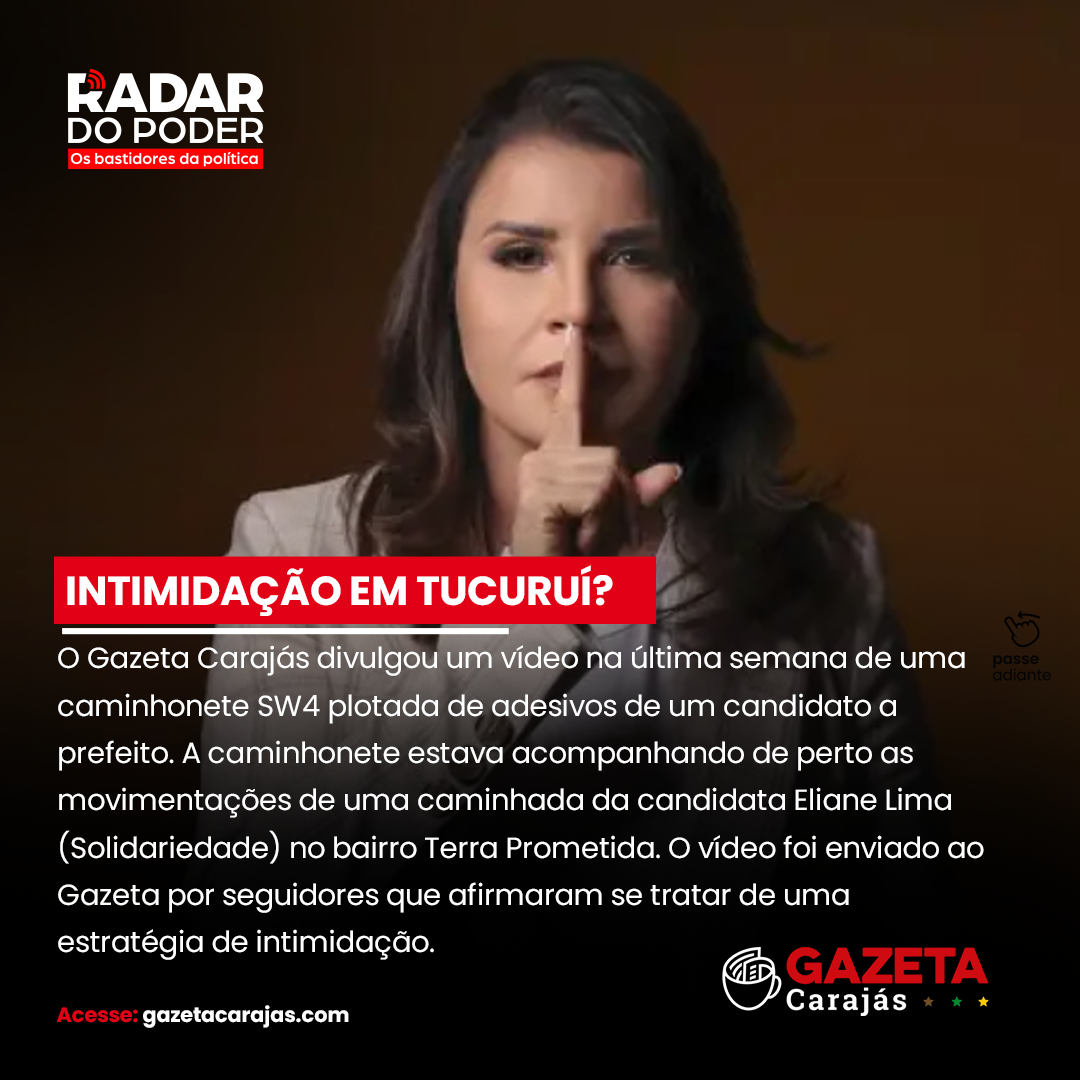 O Gazeta Carajás divulgou um vídeo na última semana de uma caminhonete SW4 plotada de adesivos de um candidato a prefeito. A caminhonete estava acompanhando de perto as movimentações de uma caminhada da candidata Eliane Lima (Solidariedade) no bairro Terra Prometida. O vídeo foi enviado ao Gazeta por seguidores que afirmaram se tratar de uma estratégia de intimidação.