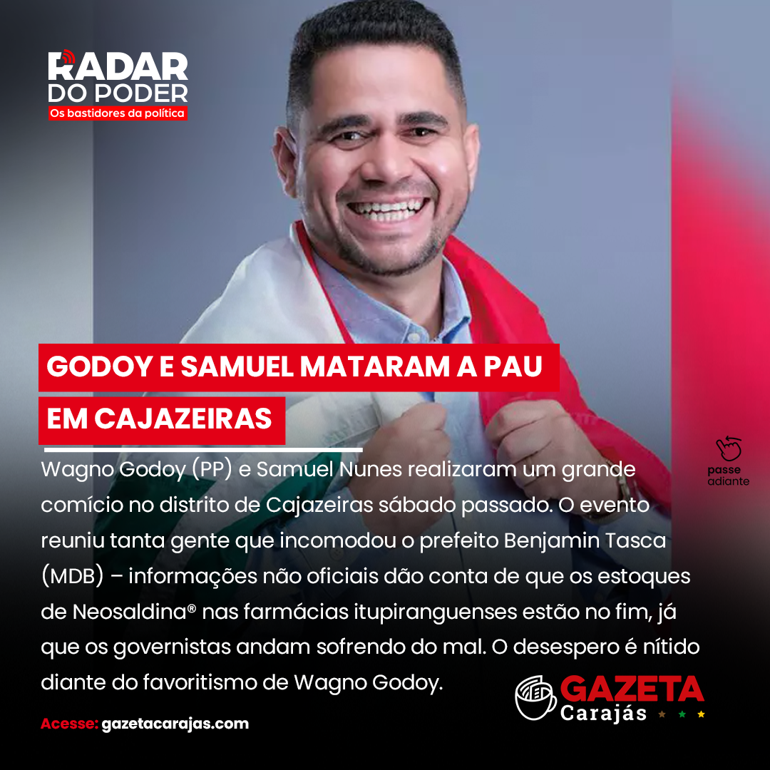 Wagno Godoy (PP) e Samuel Nunes realizaram um grande comício no distrito de Cajazeiras sábado passado. O evento reuniu tanta gente que incomodou o prefeito Benjamin Tasca (MDB) – informações não oficiais dão conta de que os estoques de Neosaldina® nas farmácias itupiranguenses estão no fim, já que os governistas andam sofrendo do mal. O desespero é nítido diante do favoritismo de Wagno Godoy.