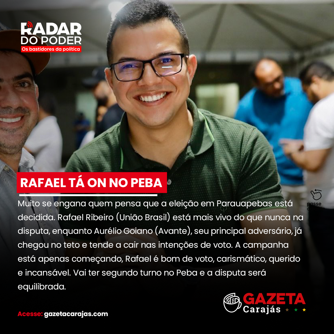 Muito se engana quem pensa que a eleição em Parauapebas está decidida. Rafael Ribeiro (União Brasil) está mais vivo do que nunca na disputa, enquanto Aurélio Goiano (Avante), seu principal adversário, já chegou no teto e tende a cair nas intenções de voto. A campanha está apenas começando, Rafael é bom de voto, carismático, querido e incansável. Vai ter segundo turno no Peba e a disputa será equilibrada.