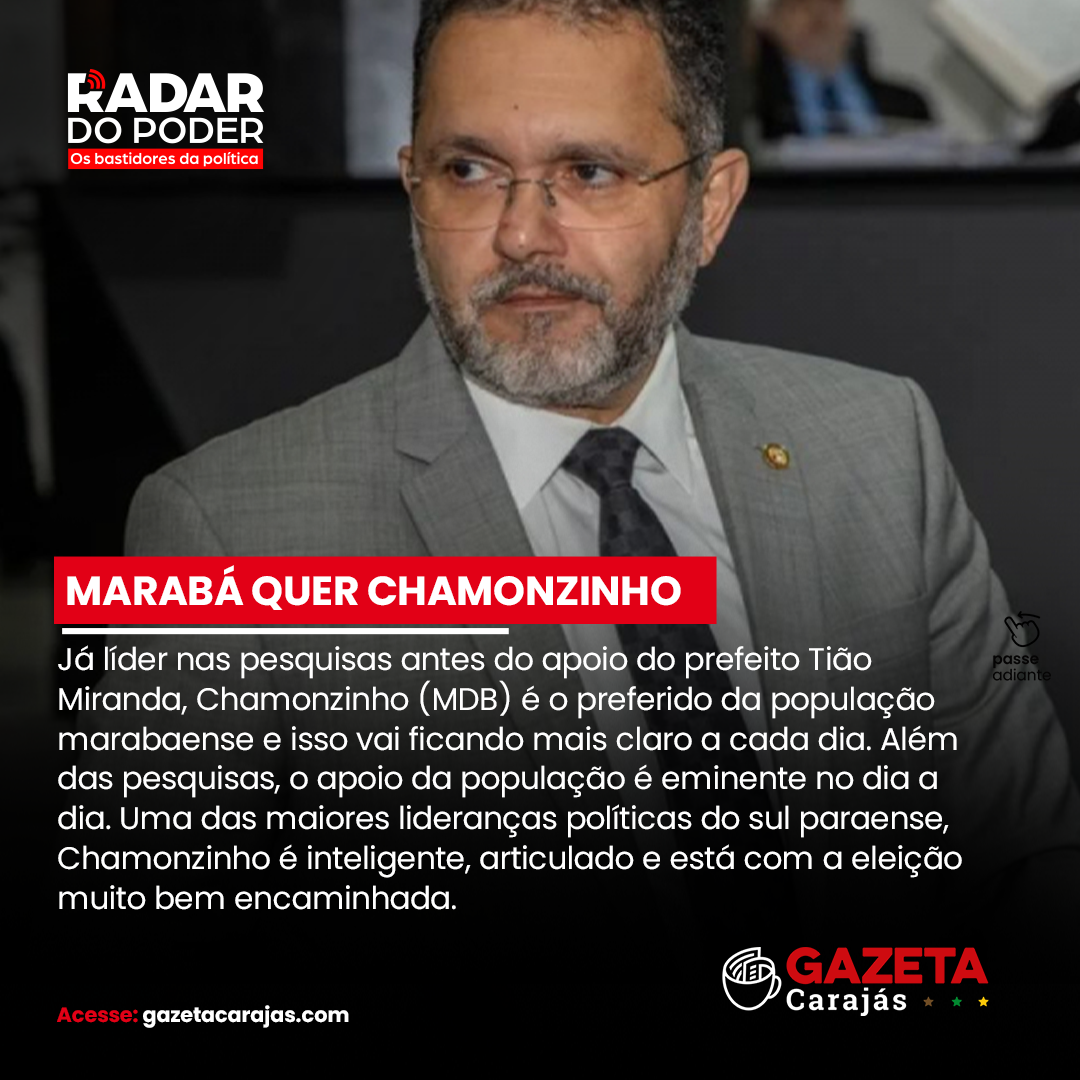 Já líder nas pesquisas antes do apoio do prefeito Tião Miranda, Chamonzinho (MDB) é o preferido da população marabaense e isso vai ficando mais claro a cada dia. Além das pesquisas, o apoio da população é eminente no dia a dia. Uma das maiores lideranças políticas do sul paraense, Chamonzinho é inteligente, articulado e está com a eleição muito bem encaminhada.