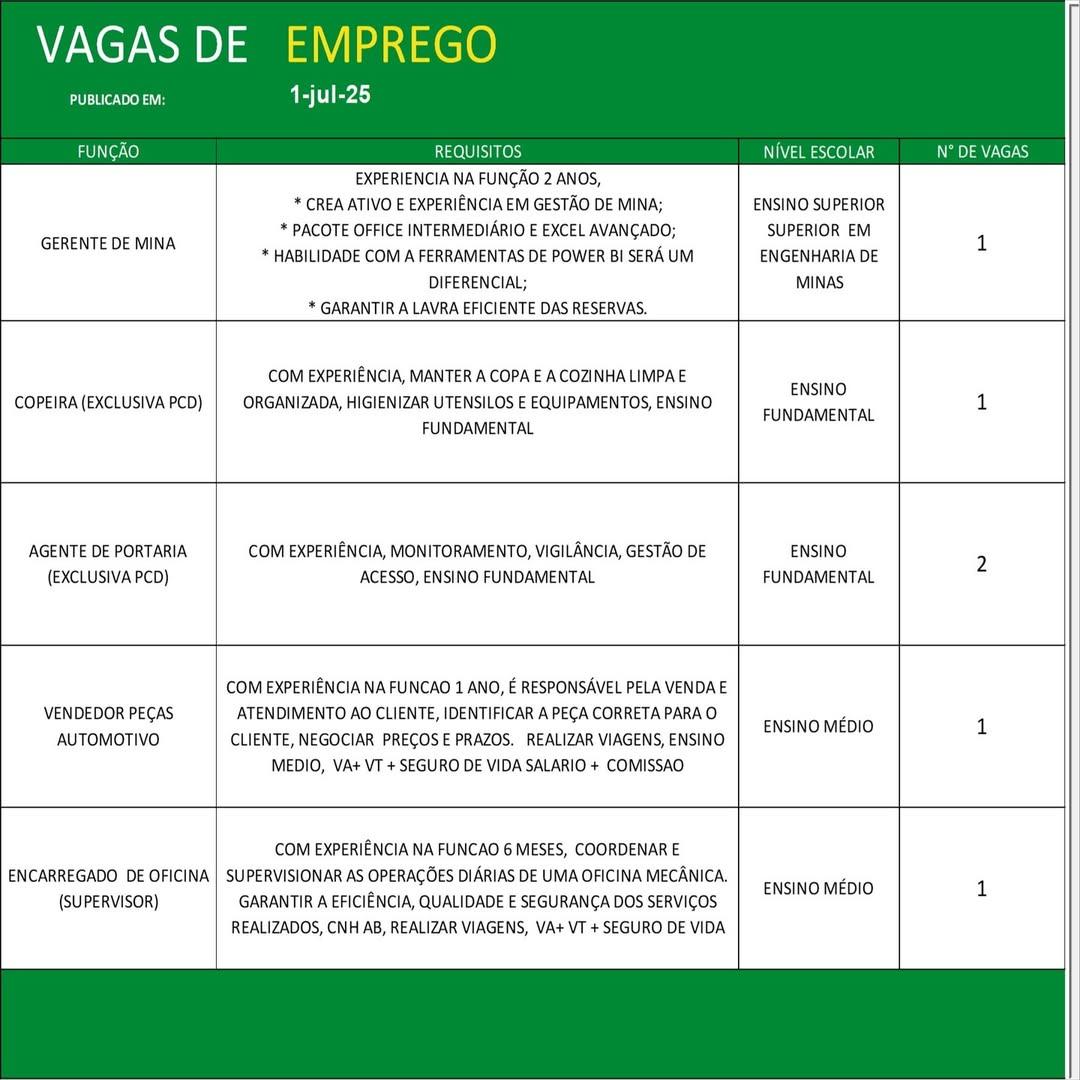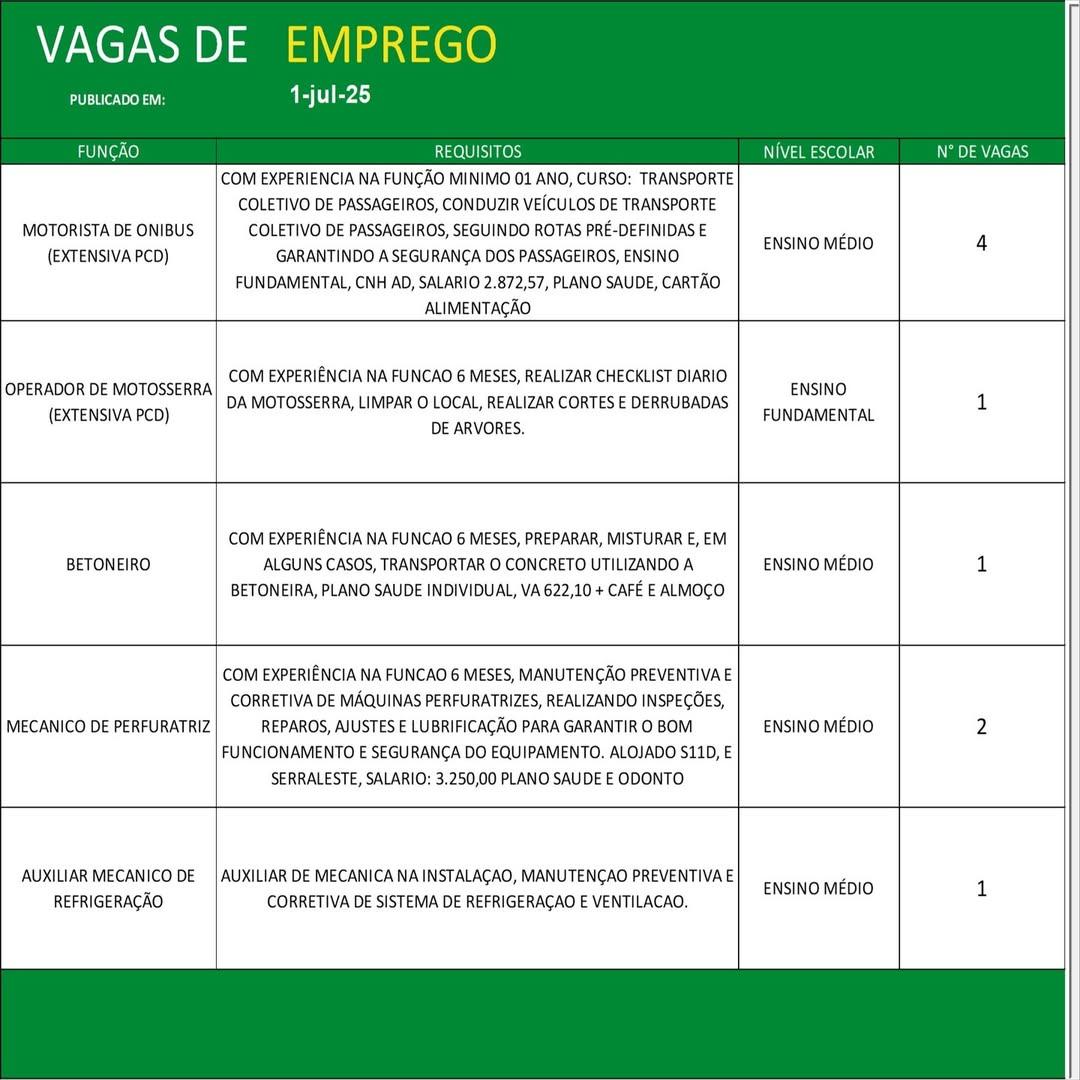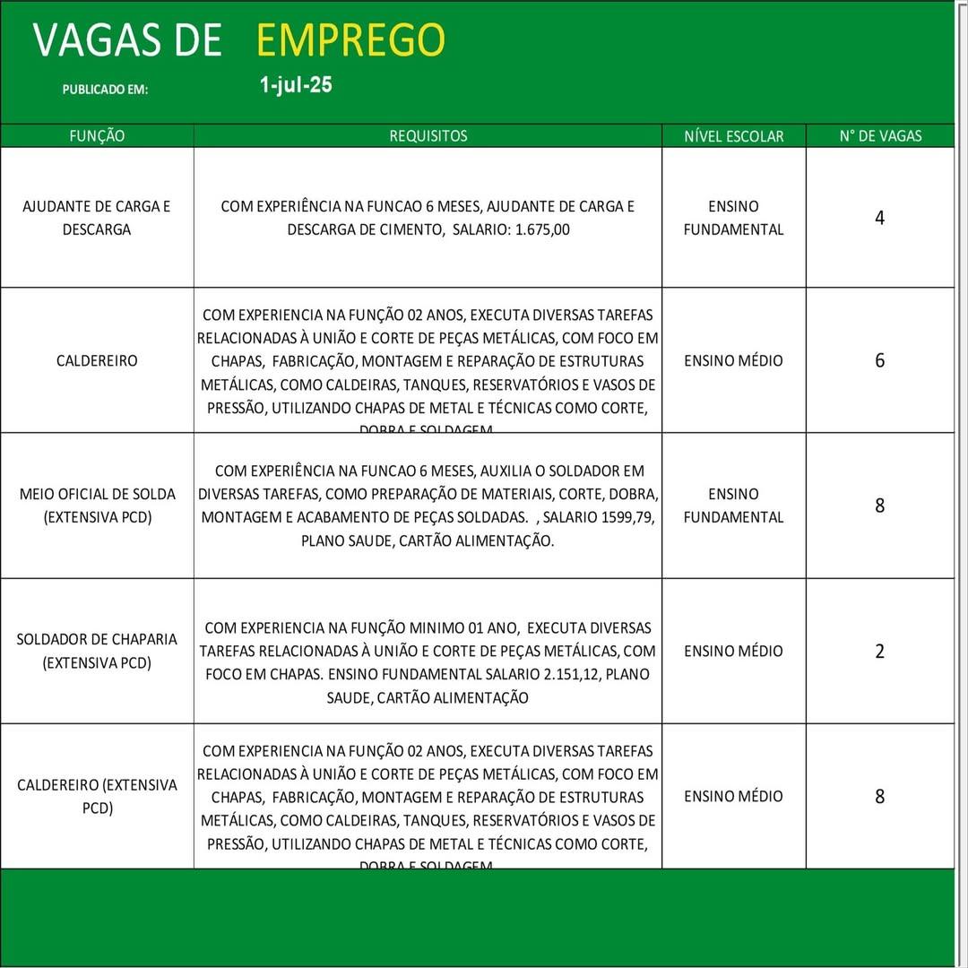 O Sine de Parauapebas divulgou as vagas em aberto nesta terça-feira (1). Os interessados devem apresentar currículo, RG, CPF, Carteira de Trabalho e comprovante de residência.