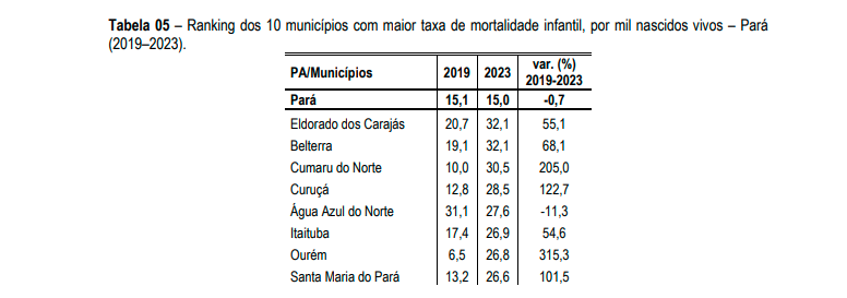 De acordo com o levantamento, a taxa de mortalidade infantil, que mede o número de óbitos de crianças com menos de um ano por mil nascidos vivos, passou de 31,1 em 2019 para 27,6 em 2023. A variação representa uma redução de 11,3%, enquanto a maioria dos municípios paraenses registrou aumento no mesmo período.