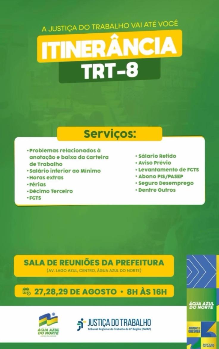 A Prefeitura de Água Azul do Norte, em parceria com o Tribunal Regional do Trabalho da 8ª Região (TRT-8), promove nos dias 27, 28 e 29 de agosto, das 8h às 16h, o programa Itinerância TRT-8, que leva os serviços da Justiça do Trabalho diretamente à população.