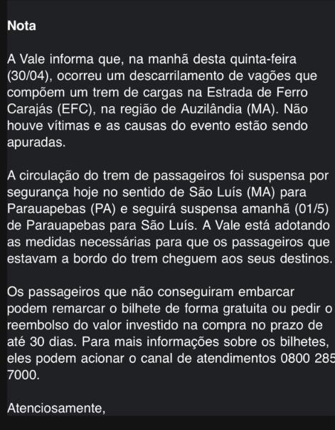 O acidente ocorreu na manhã desta quinta-feira (30), na região de Auzilândia (MA). Segundo a empresa, não houve vítimas, e as causas do descarrilamento ainda estão sendo apuradas. A confirmação veio horas após a Vale ter informado apenas que a paralisação ocorria por “motivos operacionais”, sem detalhar o ocorrido.
