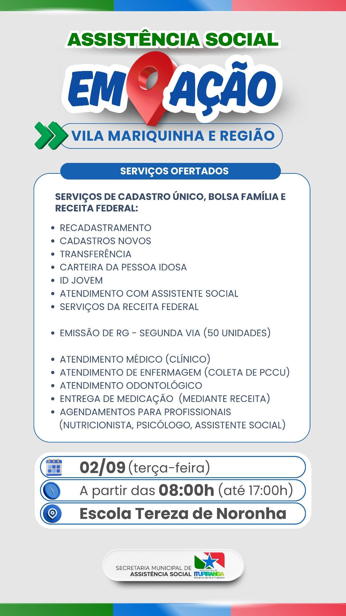 A Prefeitura de Itupiranga, por meio da Secretaria Municipal de Assistência Social, realizará na terça-feira (2), mais uma ação para a população, levando uma série de serviços gratuitos para a comunidade da Vila Mariquinha e região.