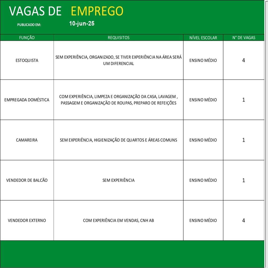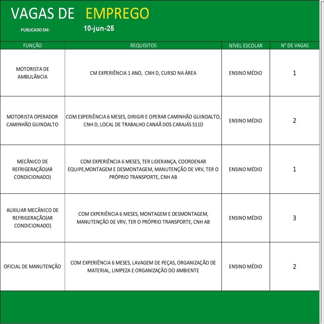 O Sine de Parauapebas divulgou as vagas em aberto nesta terça-feira (10). Os interessados devem apresentar currículo, RG, CPF, Carteira de Trabalho e comprovante de residência.