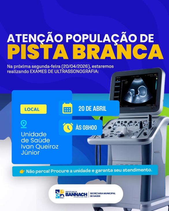 A população de Pista Branca deve ficar atenta à programação da saúde no município. Na próxima segunda-feira, dia 20 de abril, serão realizados exames de ultrassonografia na Unidade de Saúde Ivan Queiroz Júnior, com início previsto para as 8h.