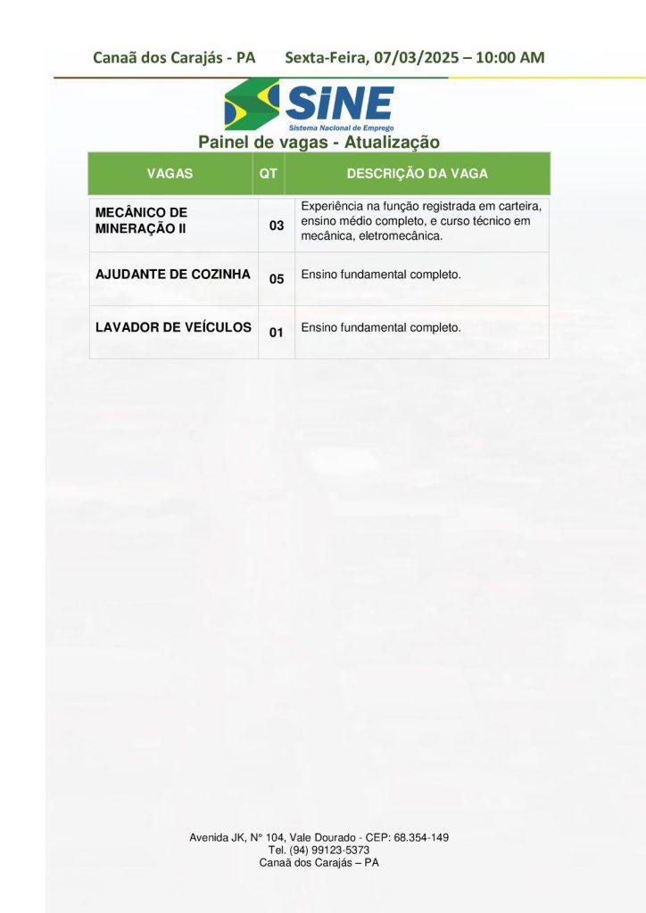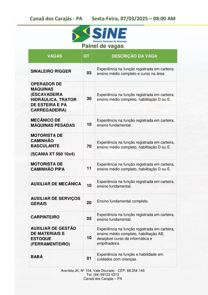 O Sine de Canaã dos Carajás divulgou as vagas em aberto nesta sexta-feira (07). Os interessados devem apresentar currículo, RG, CPF, Carteira de Trabalho e comprovante de residência. Para mais informações, ligue (94) 99123-5373.