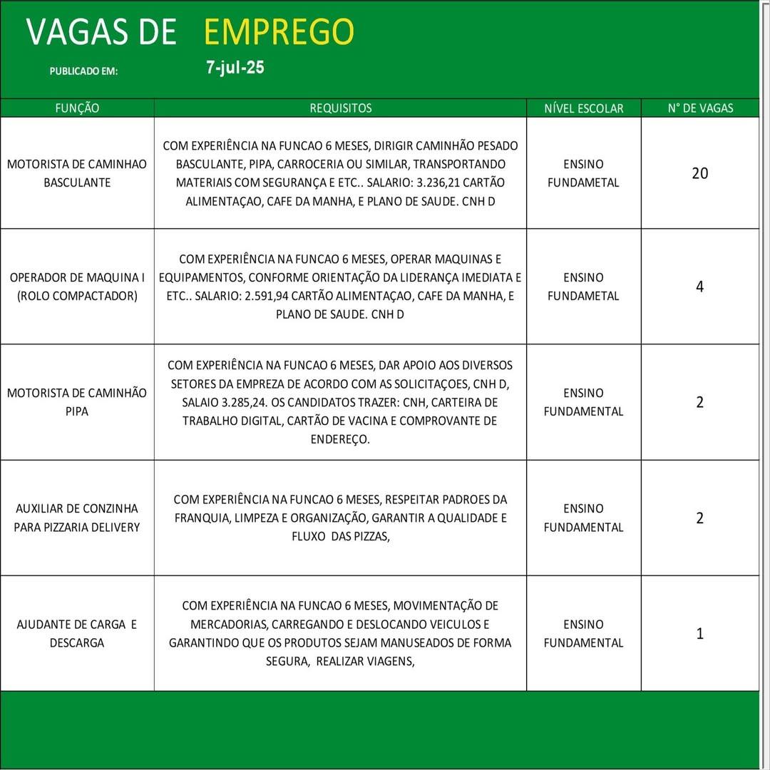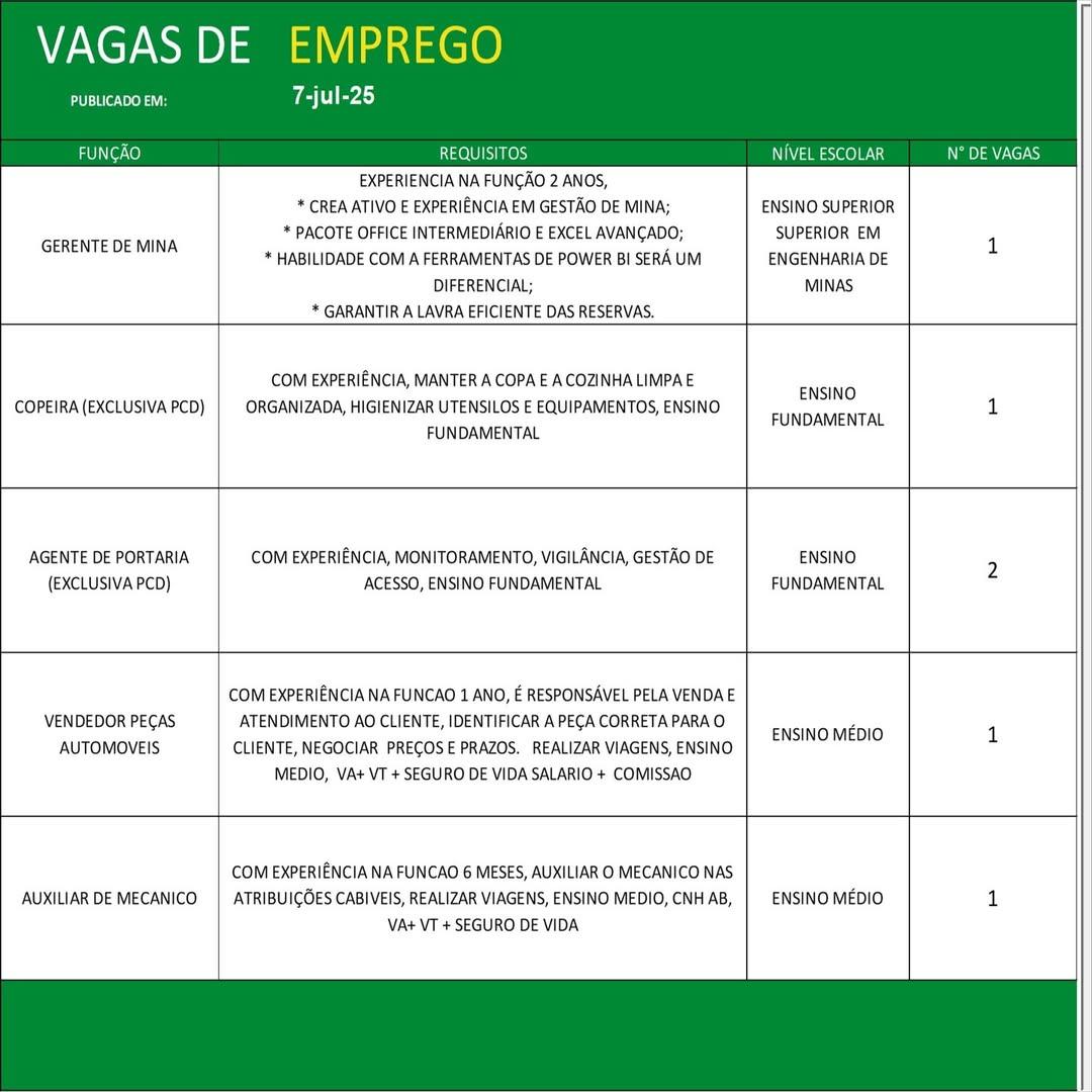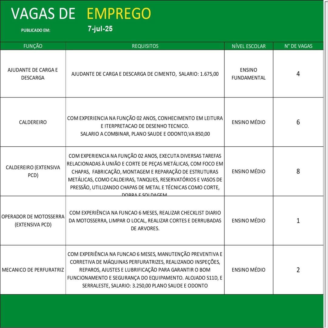 O Sine de Parauapebas divulgou as vagas em aberto nesta segunda-feira (7). Os interessados devem apresentar currículo, RG, CPF, Carteira de Trabalho e comprovante de residência.