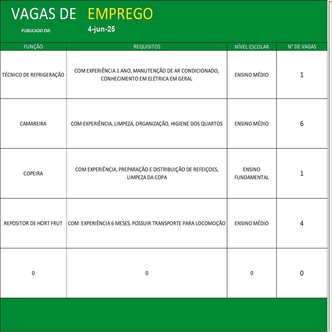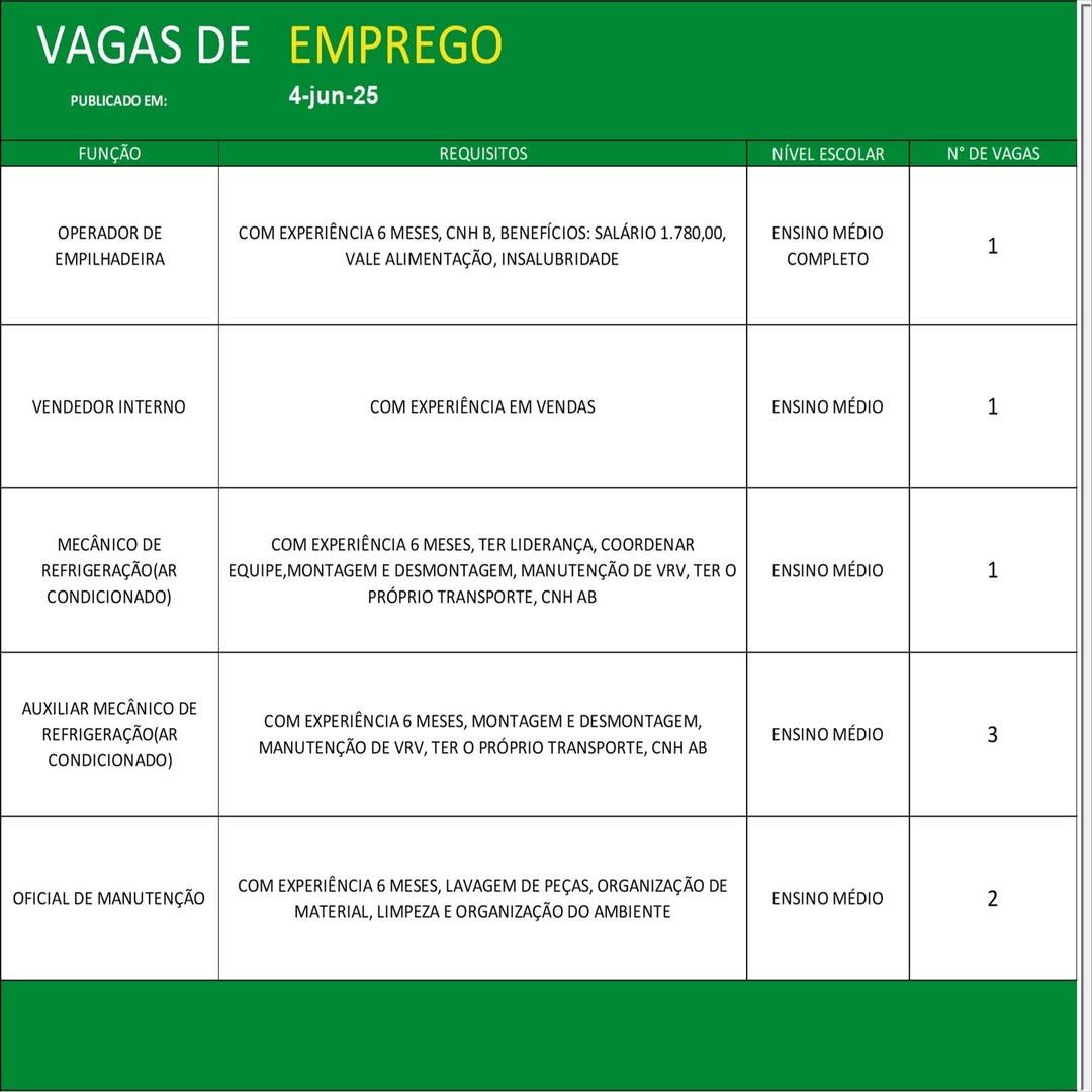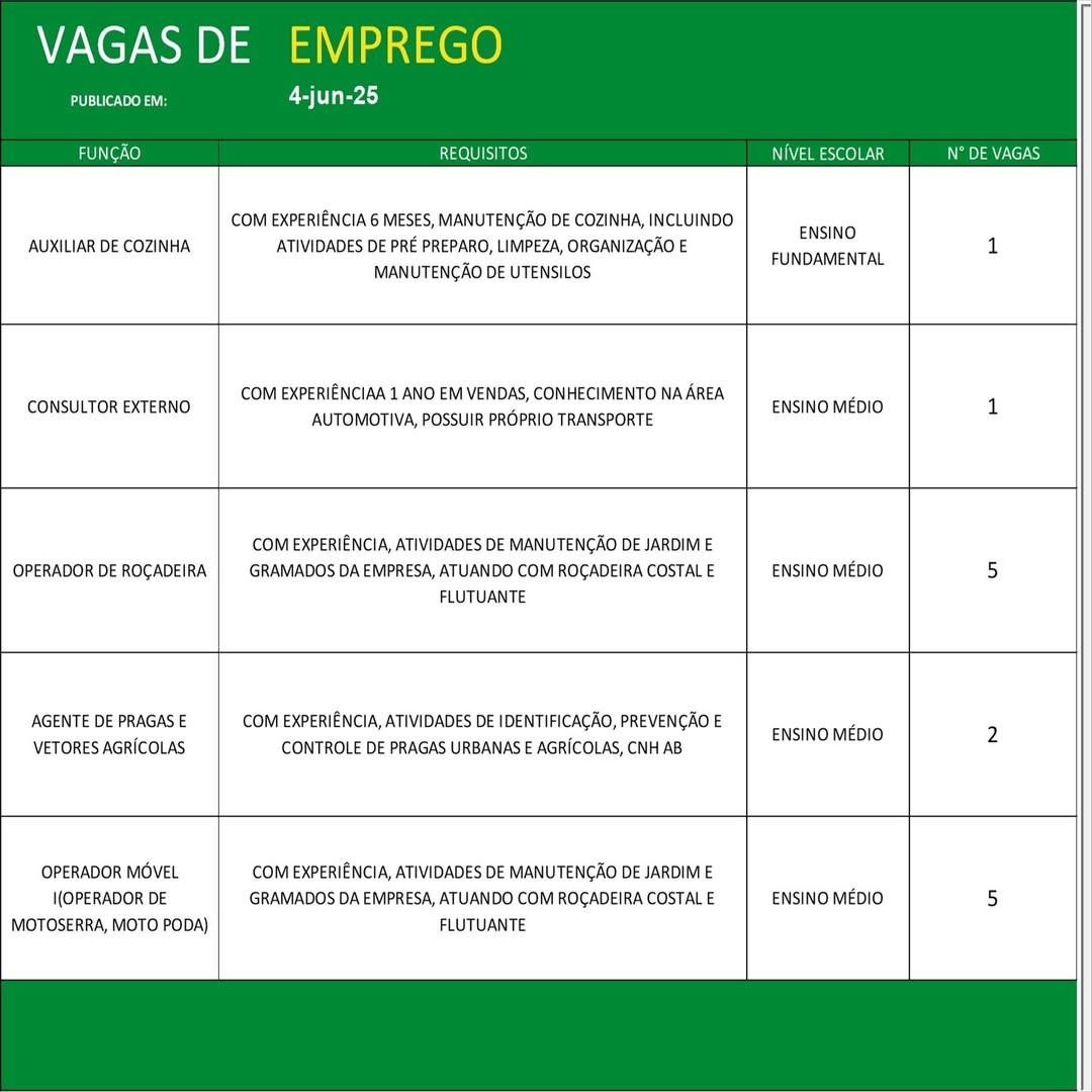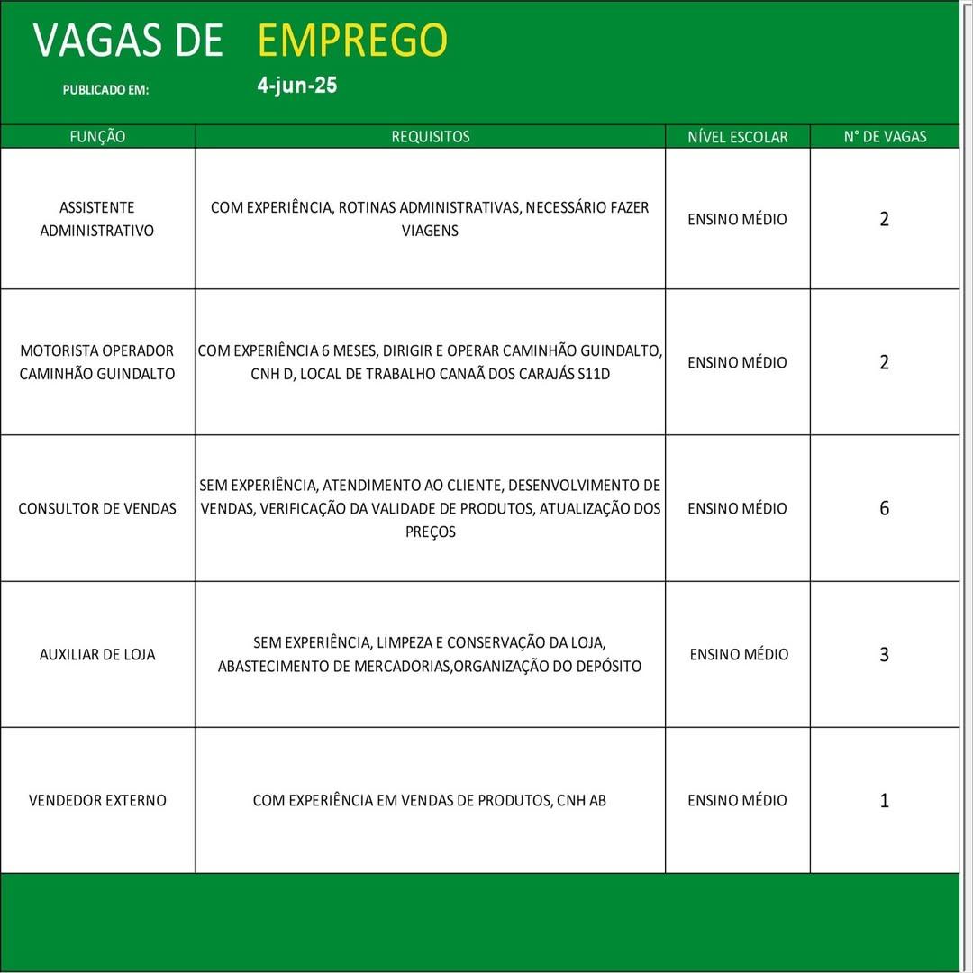 O Sine de Parauapebas divulgou as vagas em aberto nesta quarta-feira (4). Os interessados devem apresentar currículo, RG, CPF, Carteira de Trabalho e comprovante de residência.