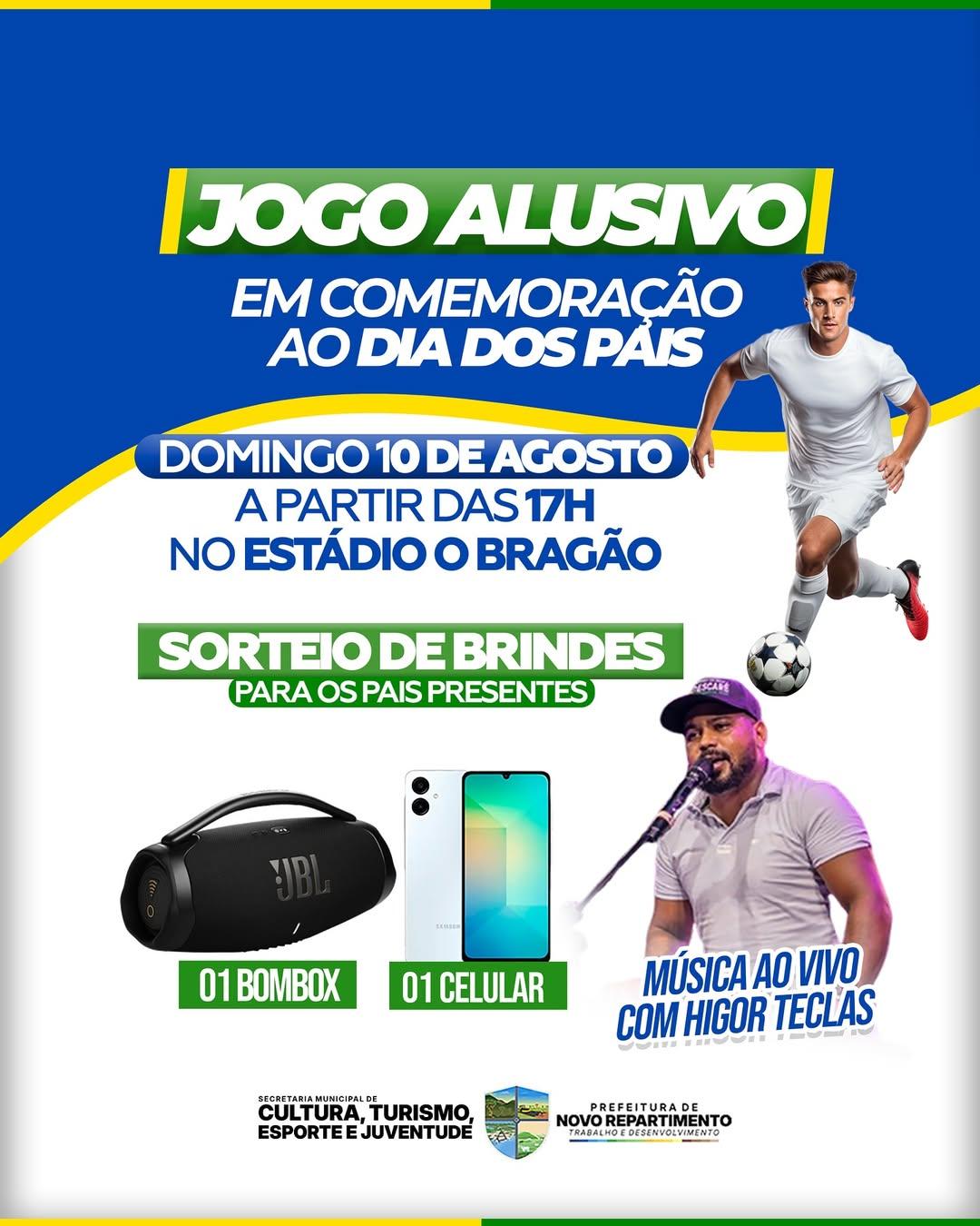 O jogo amistoso será realizado no já conhecido Estádio O Bragão, a partir das 17h, reunindo pais do município para uma partida com diversão e espírito esportivo. A festa ainda contará com música ao vivo do artista Higor Teclas e sorteio de prêmios, entre eles uma boombox e um smartphone.