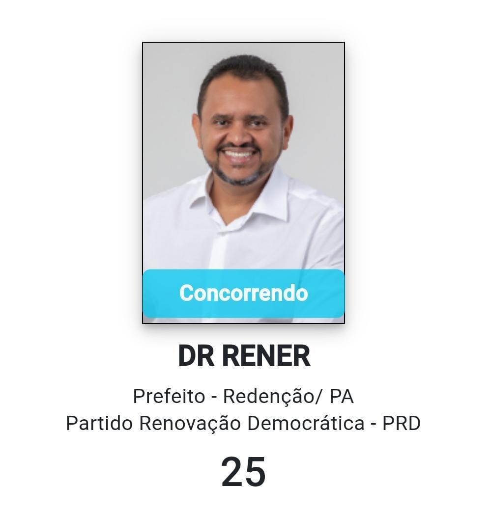 Nesta quarta-feira (14), foi registrada a candidatura de Dr.Rener (PRD) junto ao sistema do TSE. Os dados confirmam a entrada do candidato nas eleições municipais de Redenção. Rener terá Renata Rocha (PL) como sua candidata a vice na chapa.