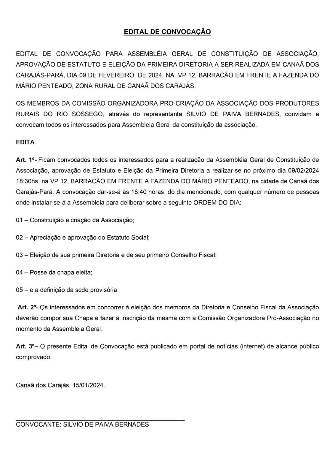 Art. 1o- Ficam convocados todos os interessados para a realização da Assembléia Geral de Constituição de Associação, aprovação de Estatuto e Eleição da Primeira Diretoria a realizar-se no próximo dia 09/02/2024 18:30hs, na VP 12, BARRACÃO EM FRENTE A FAZENDA DO MÁRIO PENTEADO, na cidade de Canaã dos Carajás-Pará.