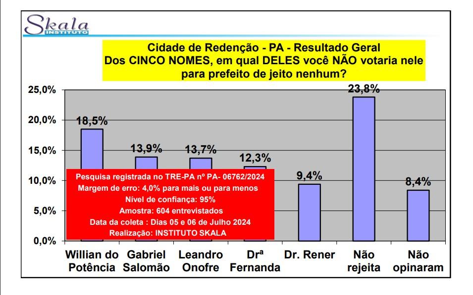O Instituto Skala ouviu 604 pessoas nos dias 5 e 6 de julho. Pesquisa foi registrada no TRE-PA com o número 06762/2024.