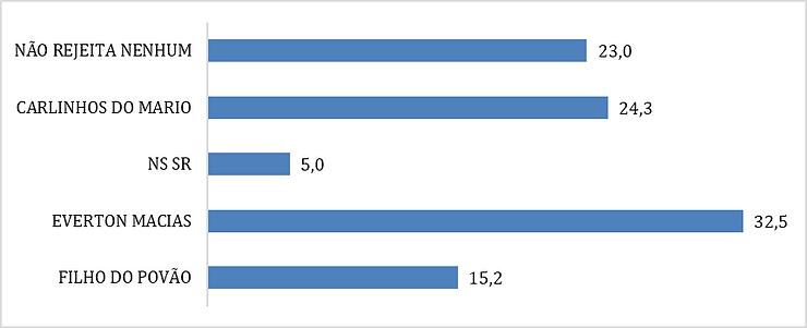 Em termos de rejeição, Everton Macias (MDB) é o candidato mais rejeitado da disputa, com 32,5% dos eleitores declarando que não votariam nele. Carlinhos do Mario (Solidariedade) aparece com 24,3% de rejeição, seguido por Filho do Povão (PP), o candidato menos rejeitado entre o eleitorado de Nova Ipixuna, com 15,2%. Além disso, 23,0% dos entrevistados afirmaram que não rejeitam nenhum dos candidatos, enquanto 3% não souberam ou não quiseram responder.