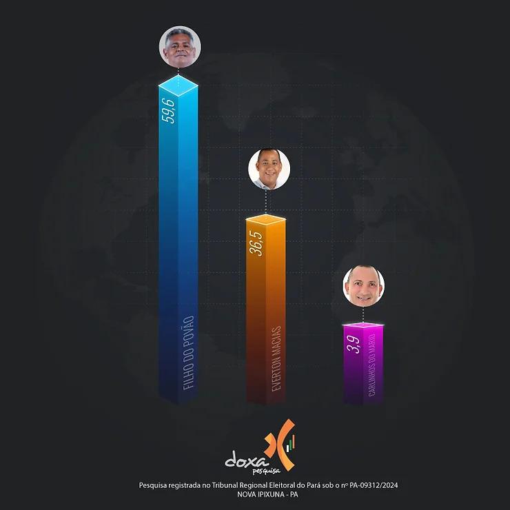 No município de Nova Ipixuna, a disputa eleitoral esta como certa para o candidato Filho do Povão (PP), que segundo pesquisa Doxa, será eleito tranquilamente nas eleições deste domingo (06). Filho possui 59,6% das intenções de votos válidos, seguido por Everton Macias (MDB) em segundo lugar com 36,5%, e Carlinhos do Mario (Solidariedade), que aparece em terceiro com 3,9%.