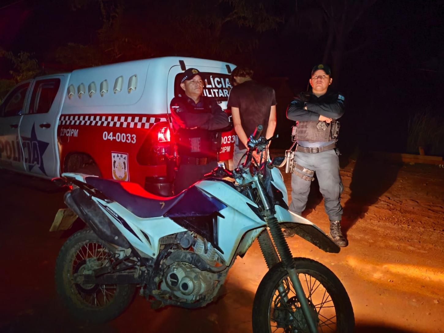 Após tomar conhecimento da ocorrência, os policiais iniciaram diligências e se deslocaram até a vicinal Trans Tuerê, nas proximidades da Vila Maracajá, onde localizaram e abordaram o suspeito, identificado como R. S. de Brito, que conduzia uma motocicleta Honda Bros, de cor branca, placa RWT7C19.