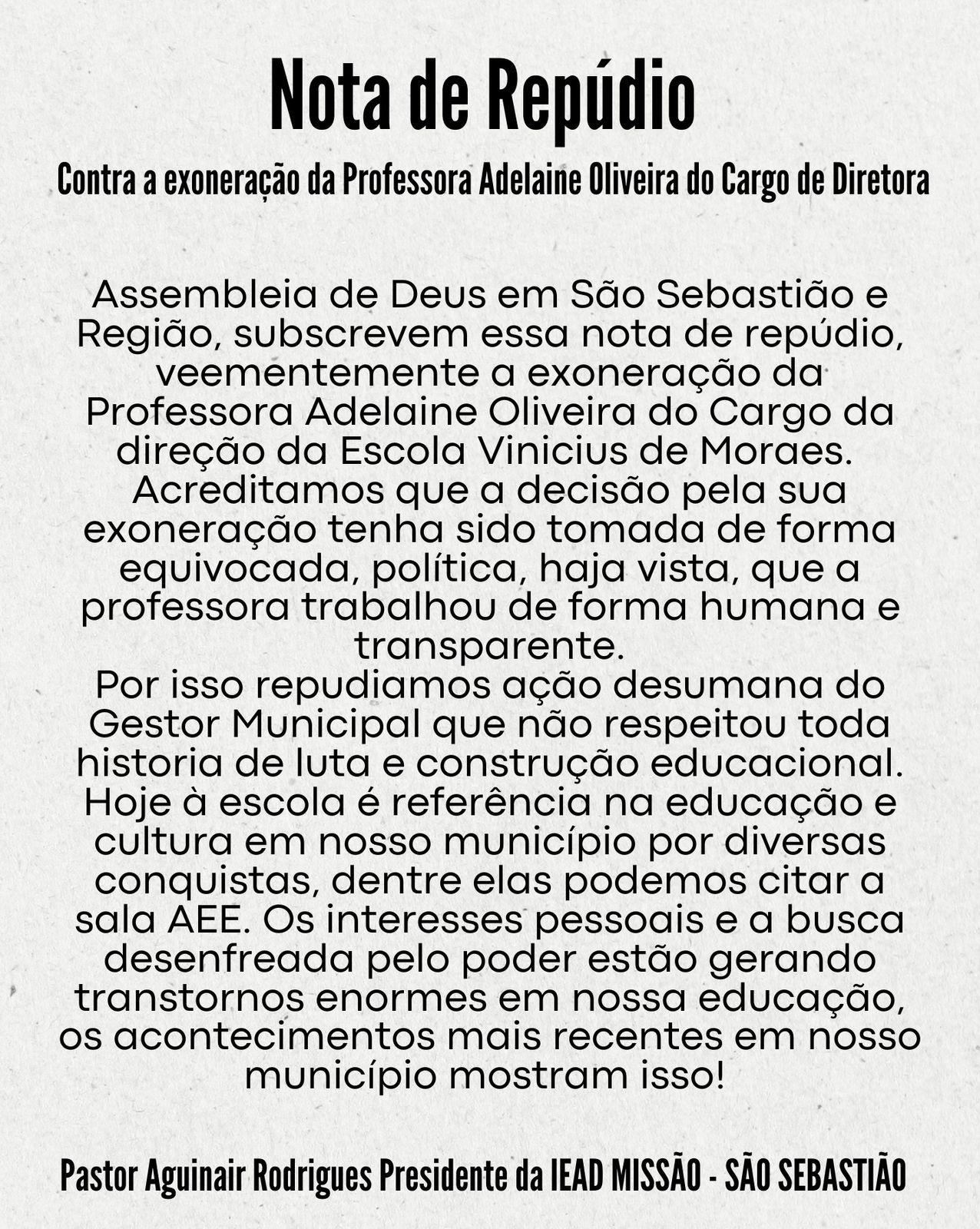 A nota, assinada pelo pastor Aguinair Rodrigues, presidente da igreja na comunidade, afirma que a decisão “política” foi tomada de forma equivocada e que a professora Adelaine sempre trabalhou de forma humana e transparente no município.