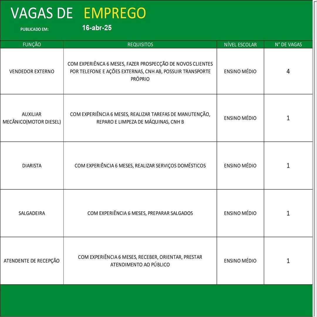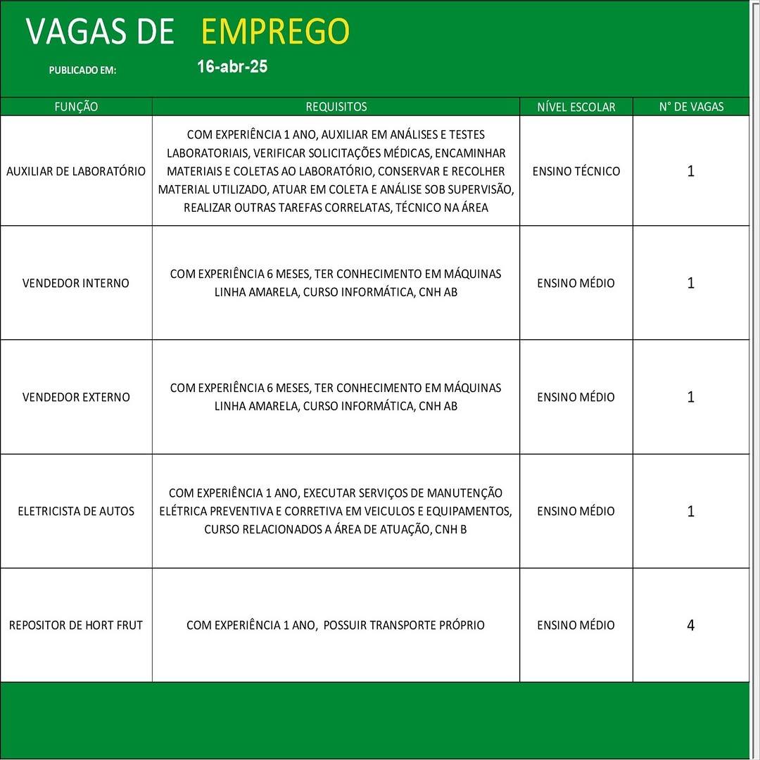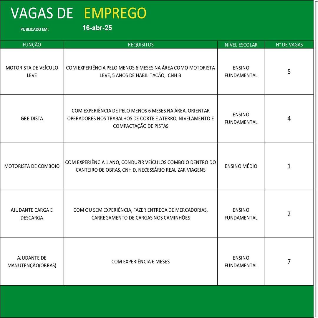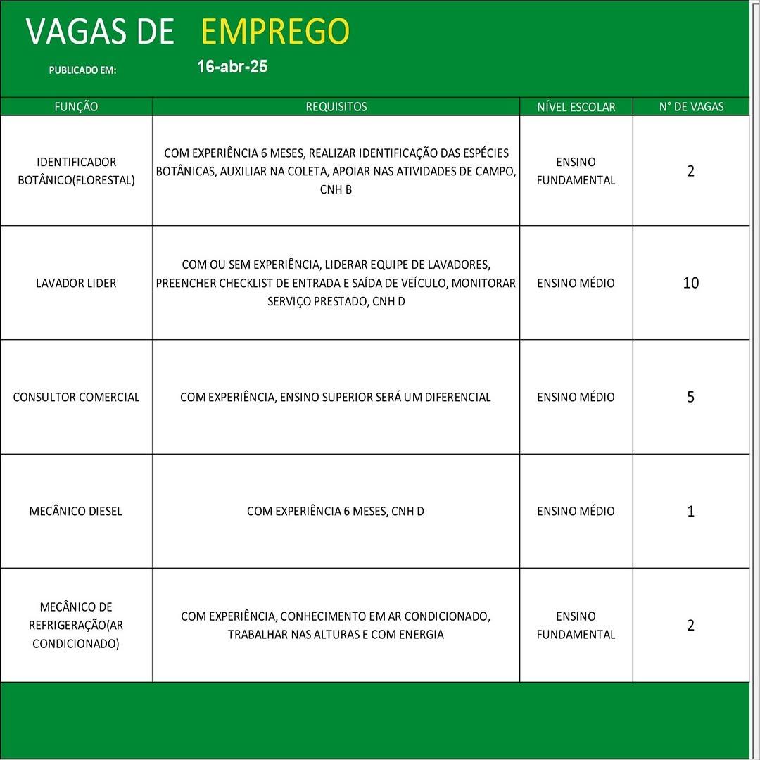 O Sine de Parauapebas divulgou as vagas em aberto nesta quarta-feira (16). Os interessados devem apresentar currículo, RG, CPF, Carteira de Trabalho e comprovante de residência.
