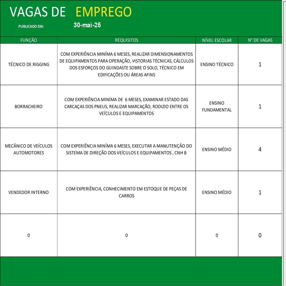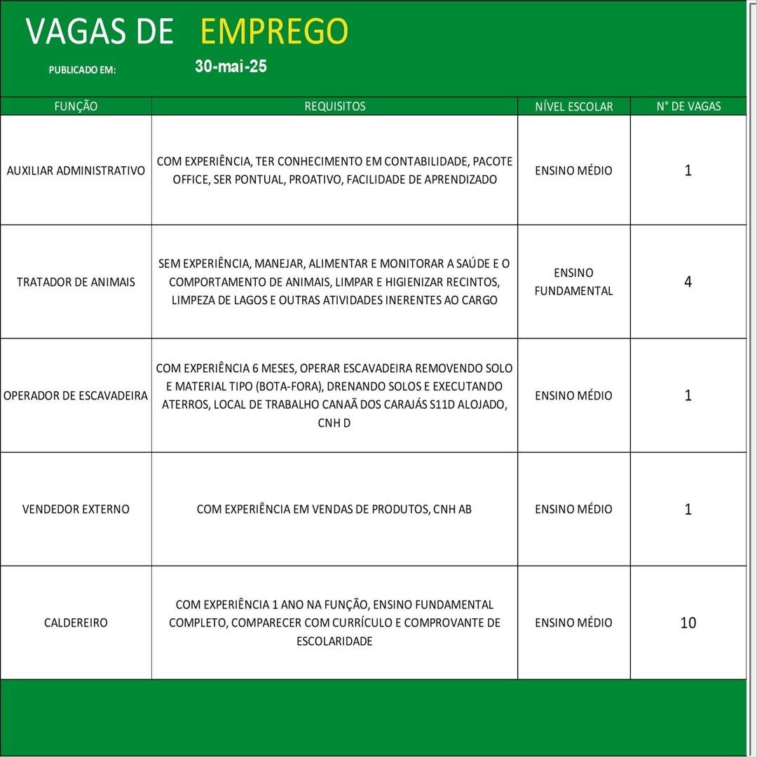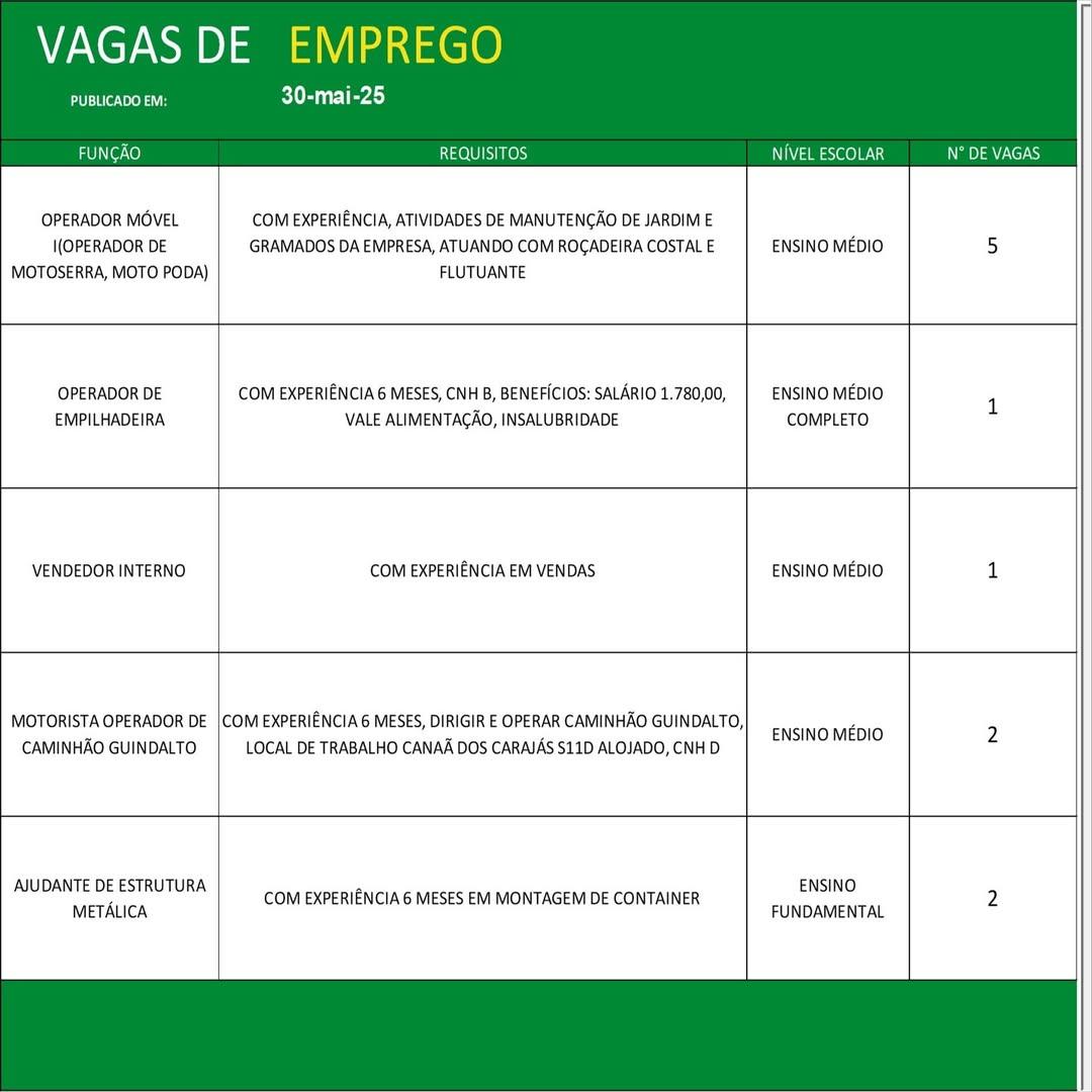 O Sine de Parauapebas divulgou as vagas em aberto nesta sexta-feira (30). Os interessados devem apresentar currículo, RG, CPF, Carteira de Trabalho e comprovante de residência.