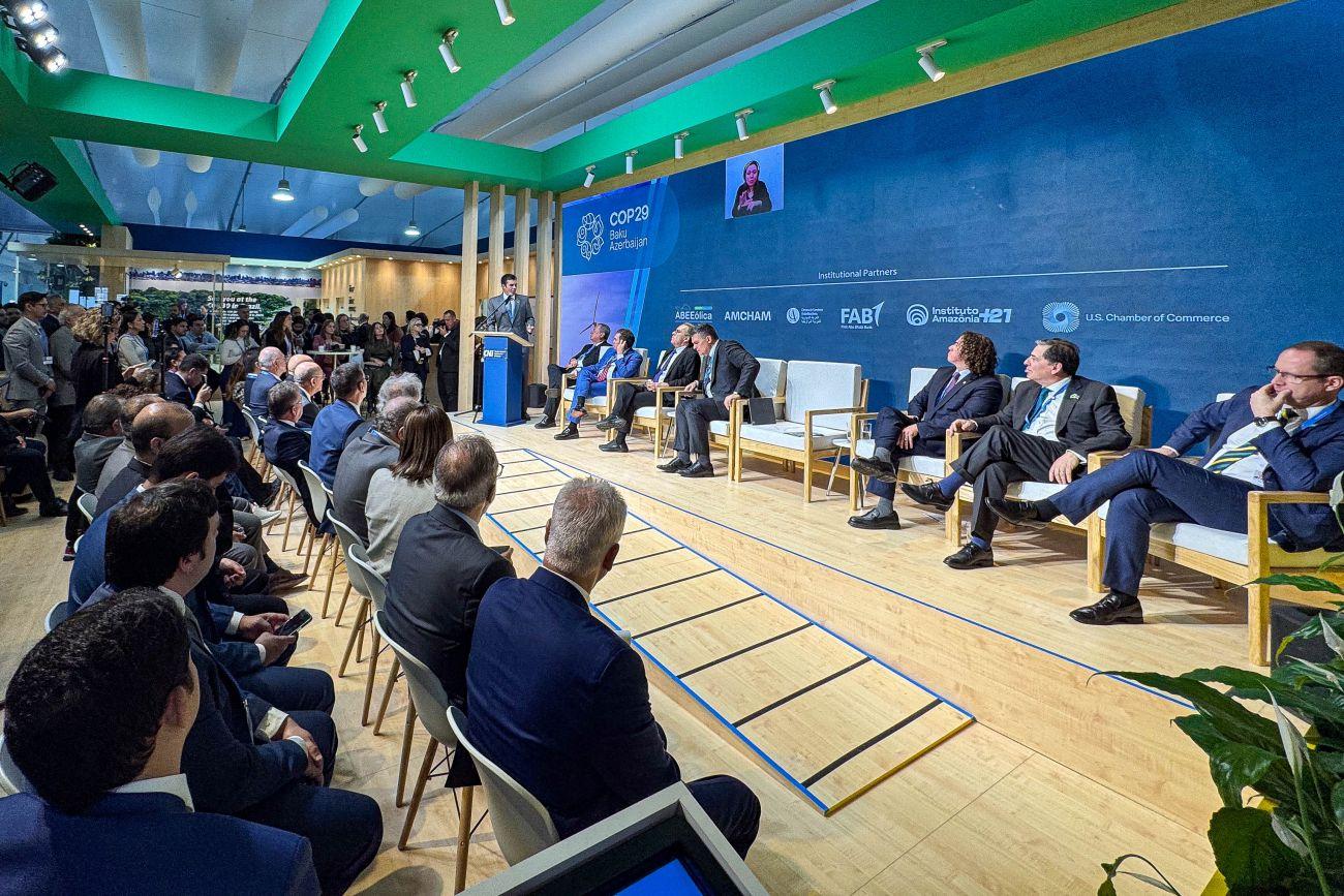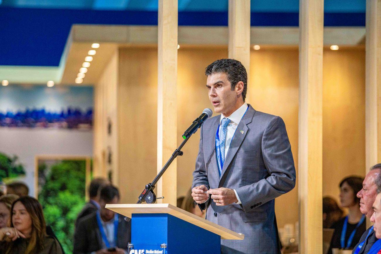 Nesta terça-feira (12), durante a Conferência das Nações Unidas sobre Mudanças Climáticas, a COP 29, realizada em Baku, no Azerbaijão, o governador do Pará, Helder Barbalho, participou de um evento no estande da Confederação Nacional da Indústria (CNI), onde abordou a importância da sustentabilidade e das oportunidades de crescimento econômico para o Brasil.