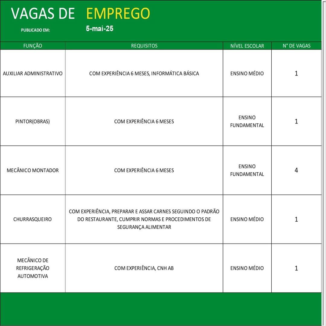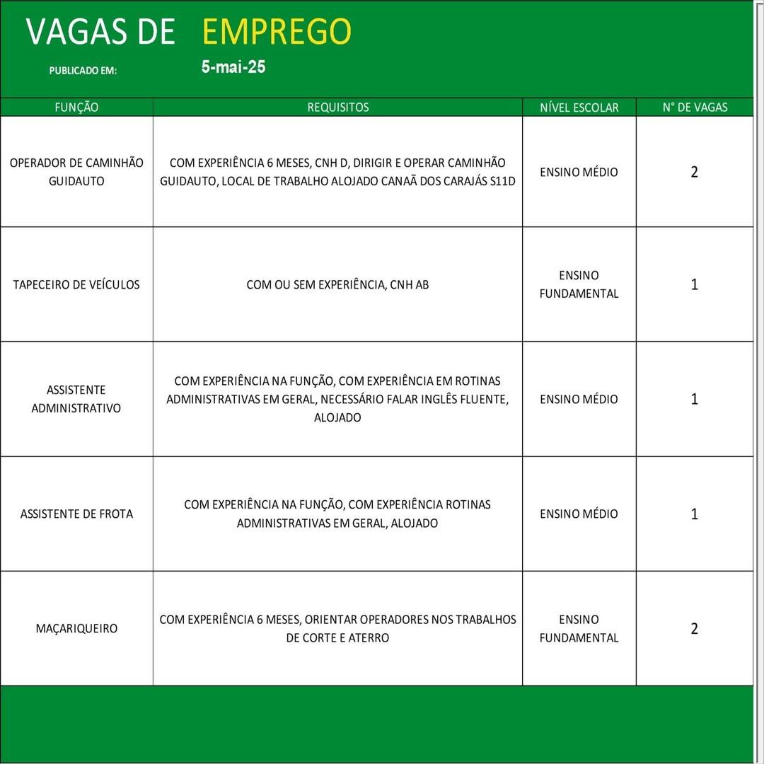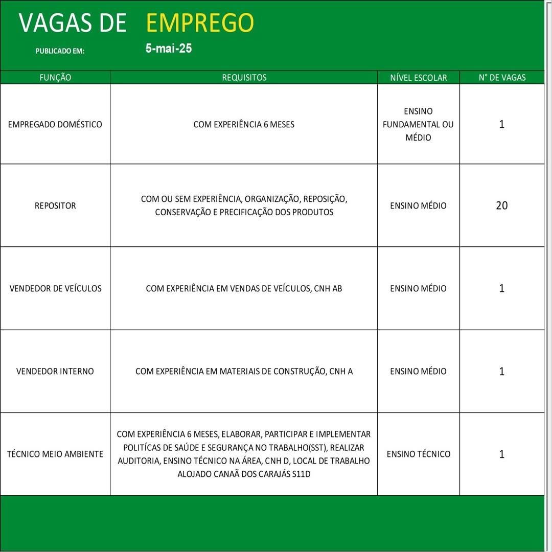 O Sine de Parauapebas divulgou as vagas em aberto nesta segunda-feira (5). Os interessados devem apresentar currículo, RG, CPF, Carteira de Trabalho e comprovante de residência.