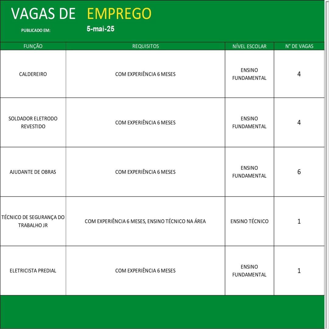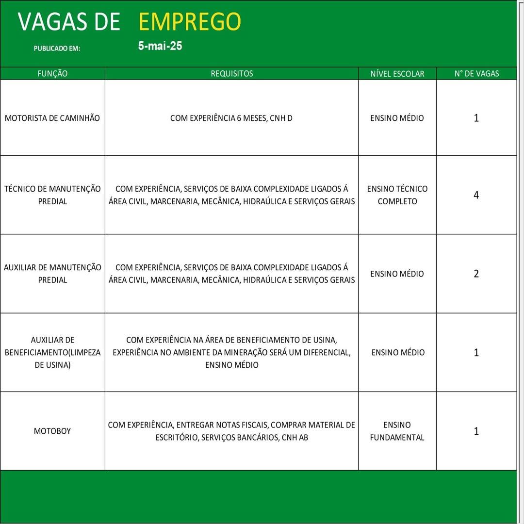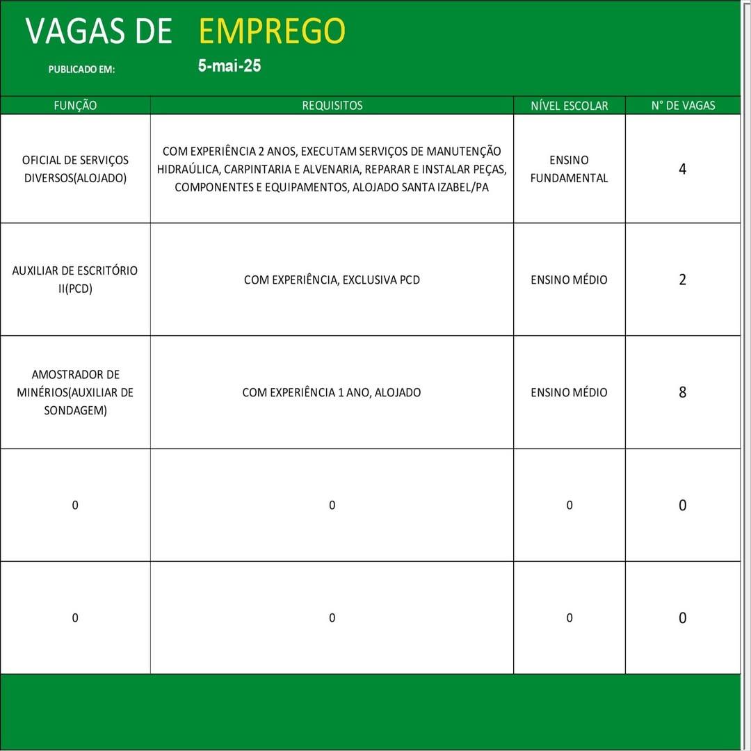 O Sine de Parauapebas divulgou as vagas em aberto nesta segunda-feira (5). Os interessados devem apresentar currículo, RG, CPF, Carteira de Trabalho e comprovante de residência.