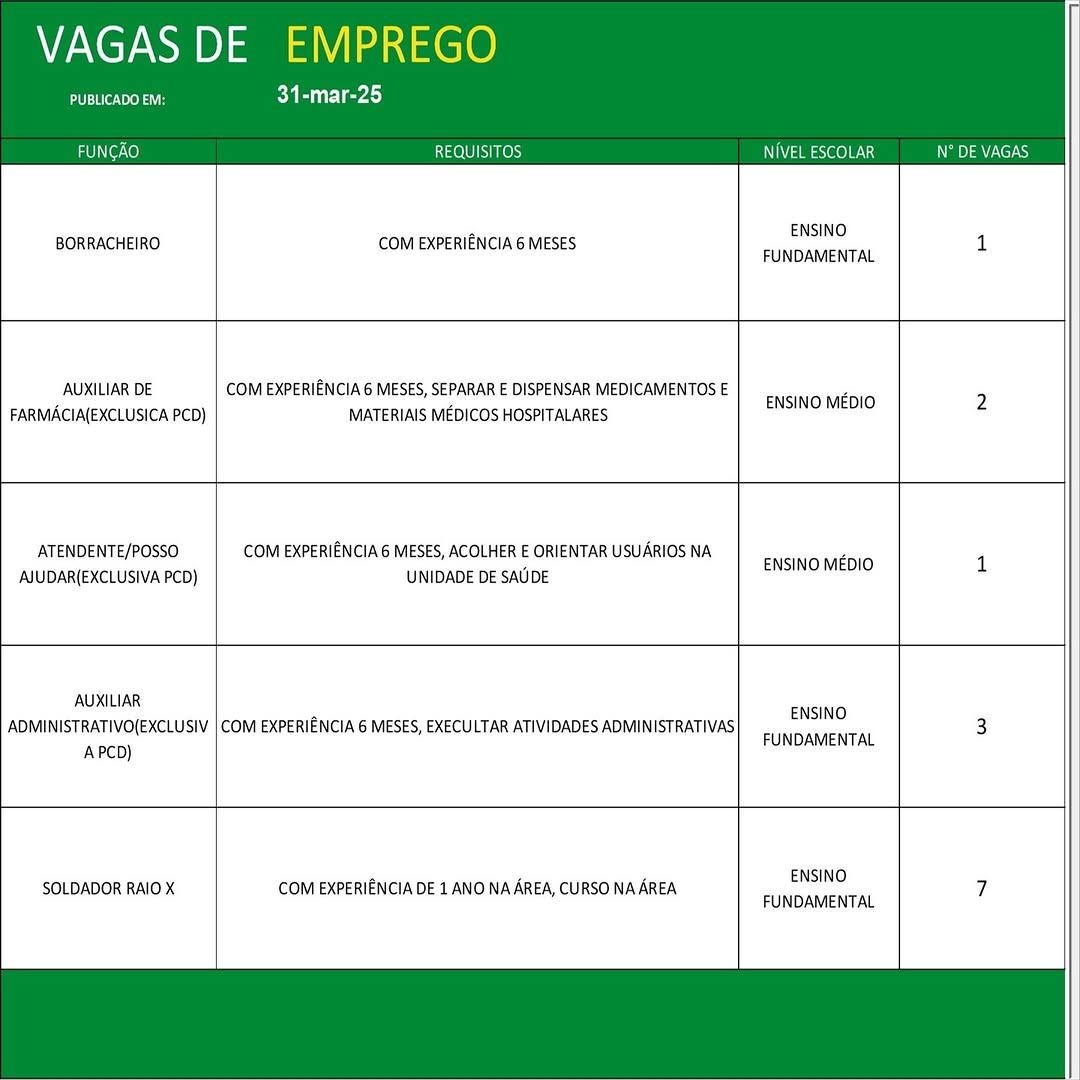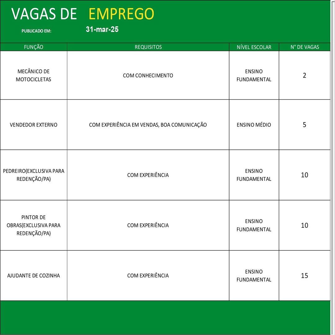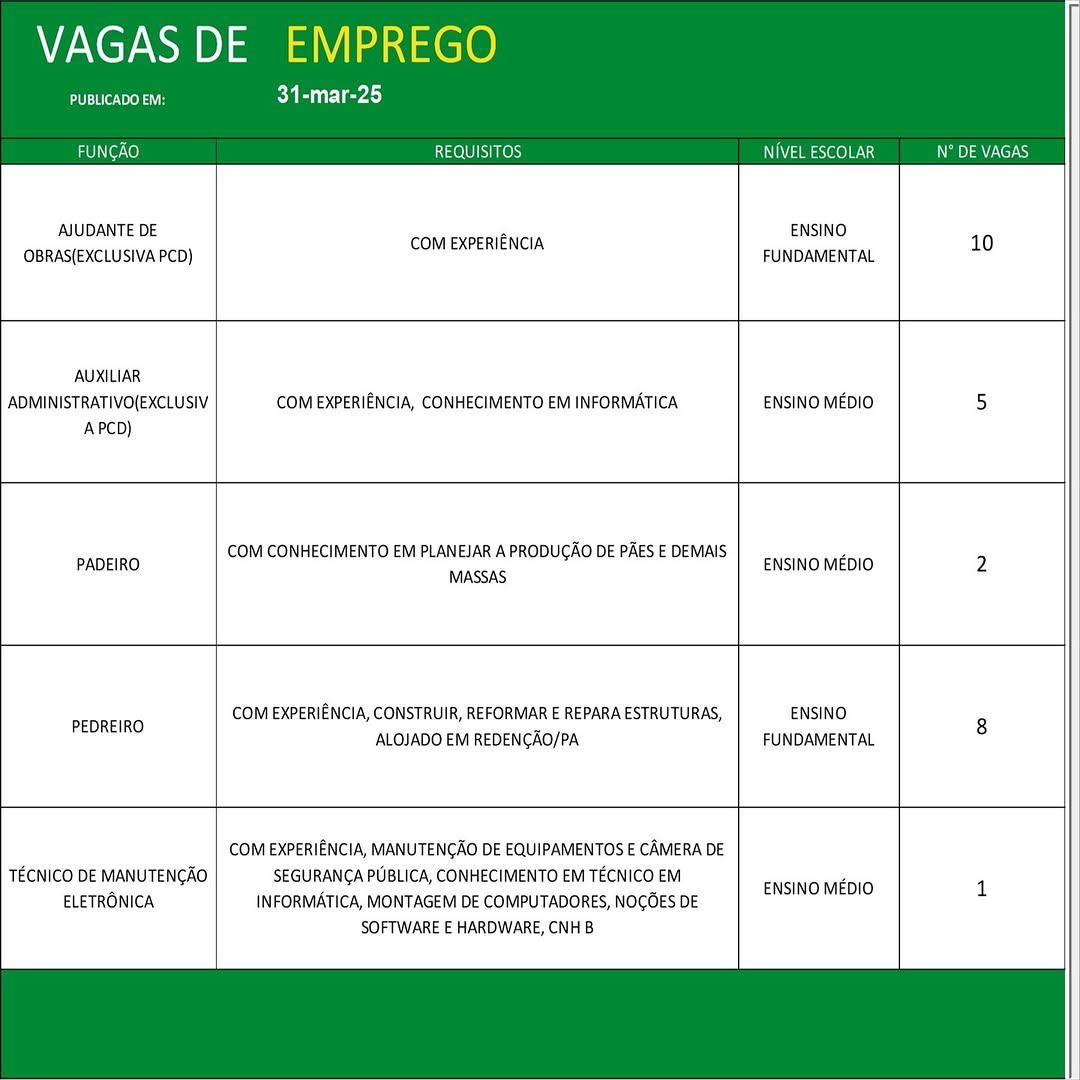 O Sine de Parauapebas divulgou as vagas em aberto nesta segunda-feira (31). Os interessados devem apresentar currículo, RG, CPF, Carteira de Trabalho e comprovante de residência.