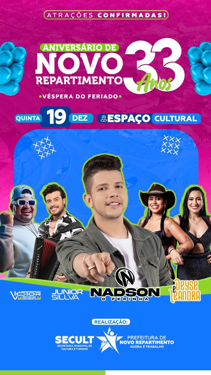 No dia 20 de dezembro, a cidade de Novo Repartimento completa 33 anos em 2024, se tornando um dos municípios mais importantes e promissores do sul e sudeste do Pará. E celebrando essa riquíssima história, a Prefeitura Municipal, por meio da Secretaria de Cultura e Turismo (SECULT), vai promover uma grande festa em homenagem a essas mais de três décadas de conquistas.