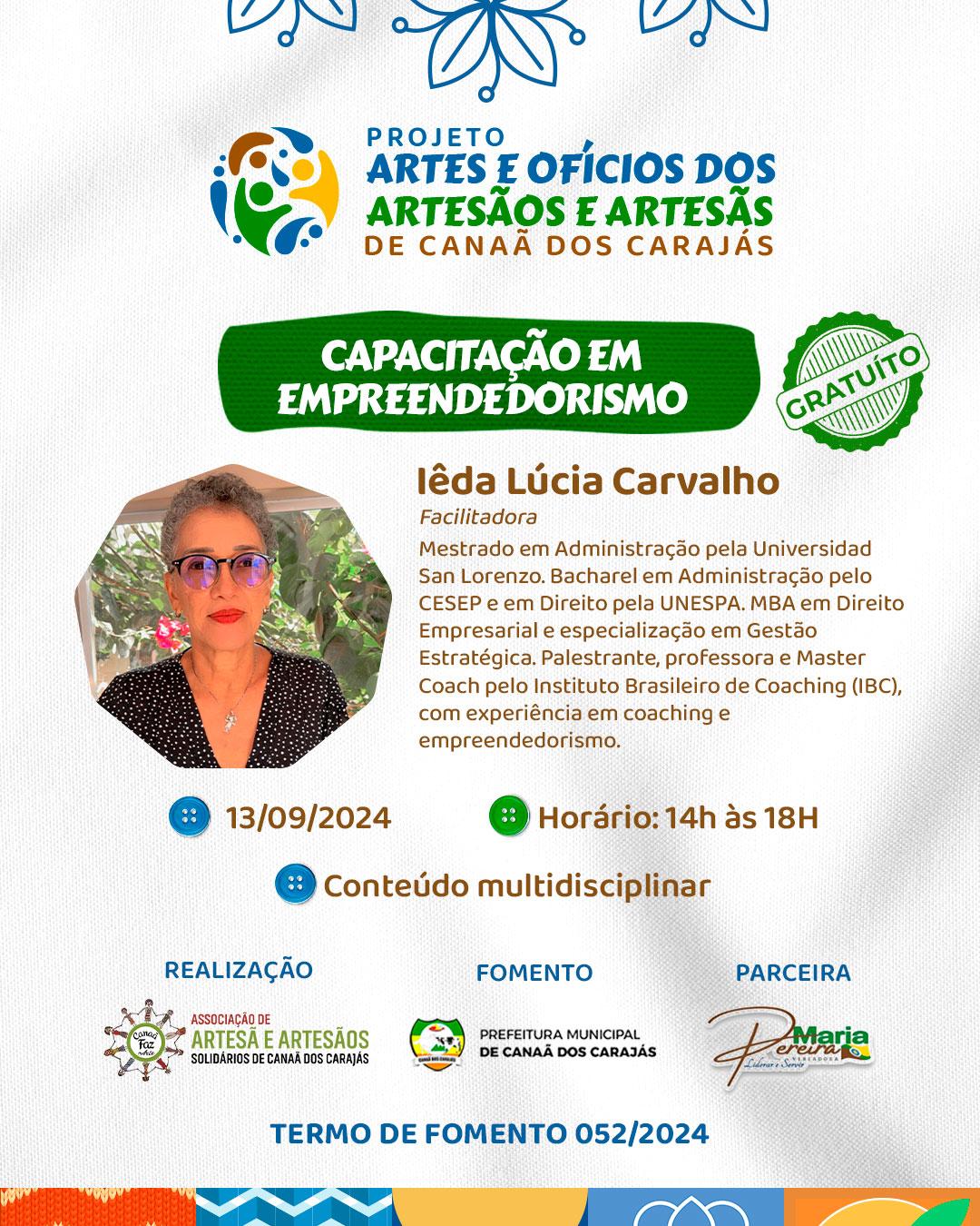 Inscritos também terão a chance de aprender sobre empreendedorismo com Iêda Lúcia Carvalho, profissional experiente da área empresarial e coaching, formada em administração e direito, com MBA em direito empresarial e especialização em gestão estratégica.
