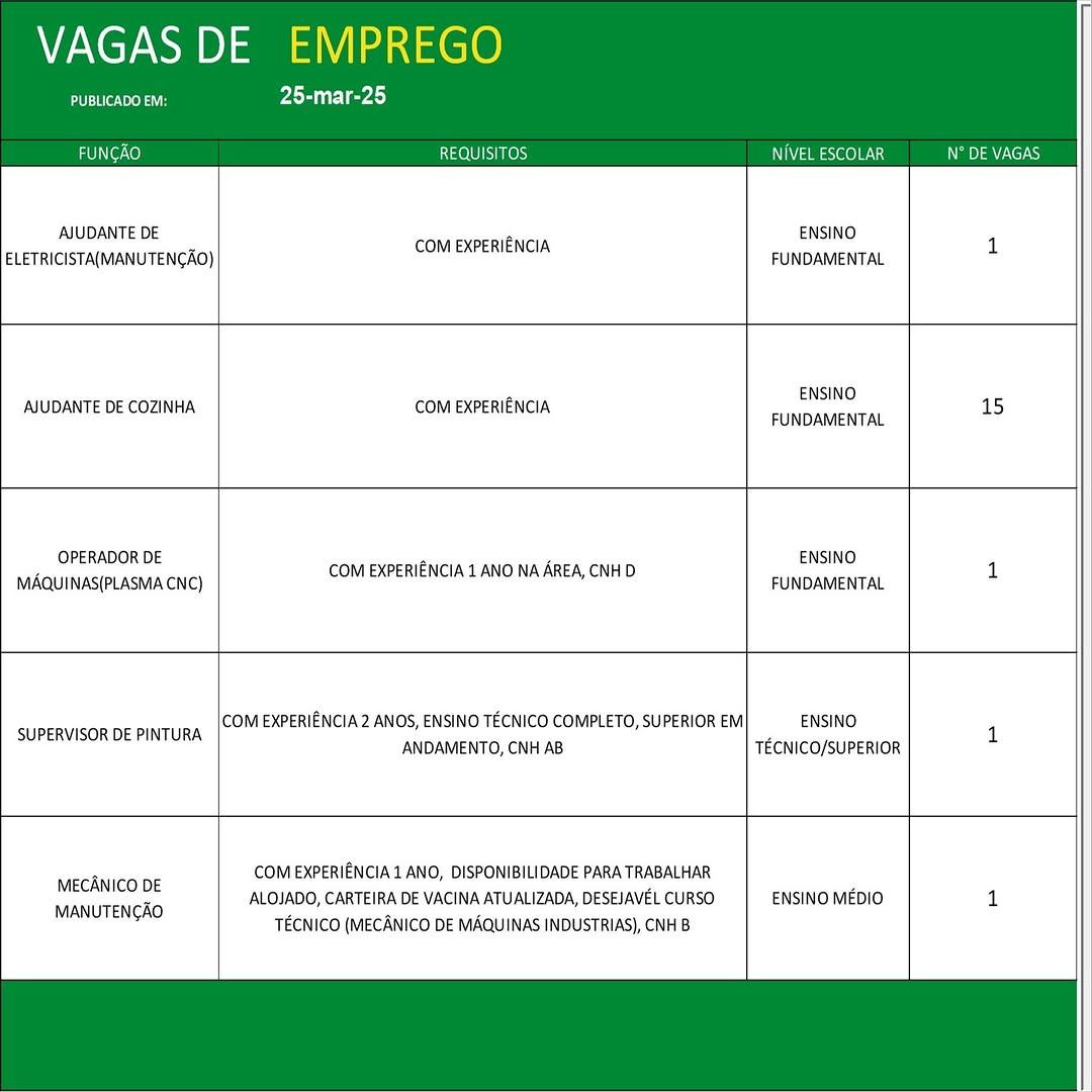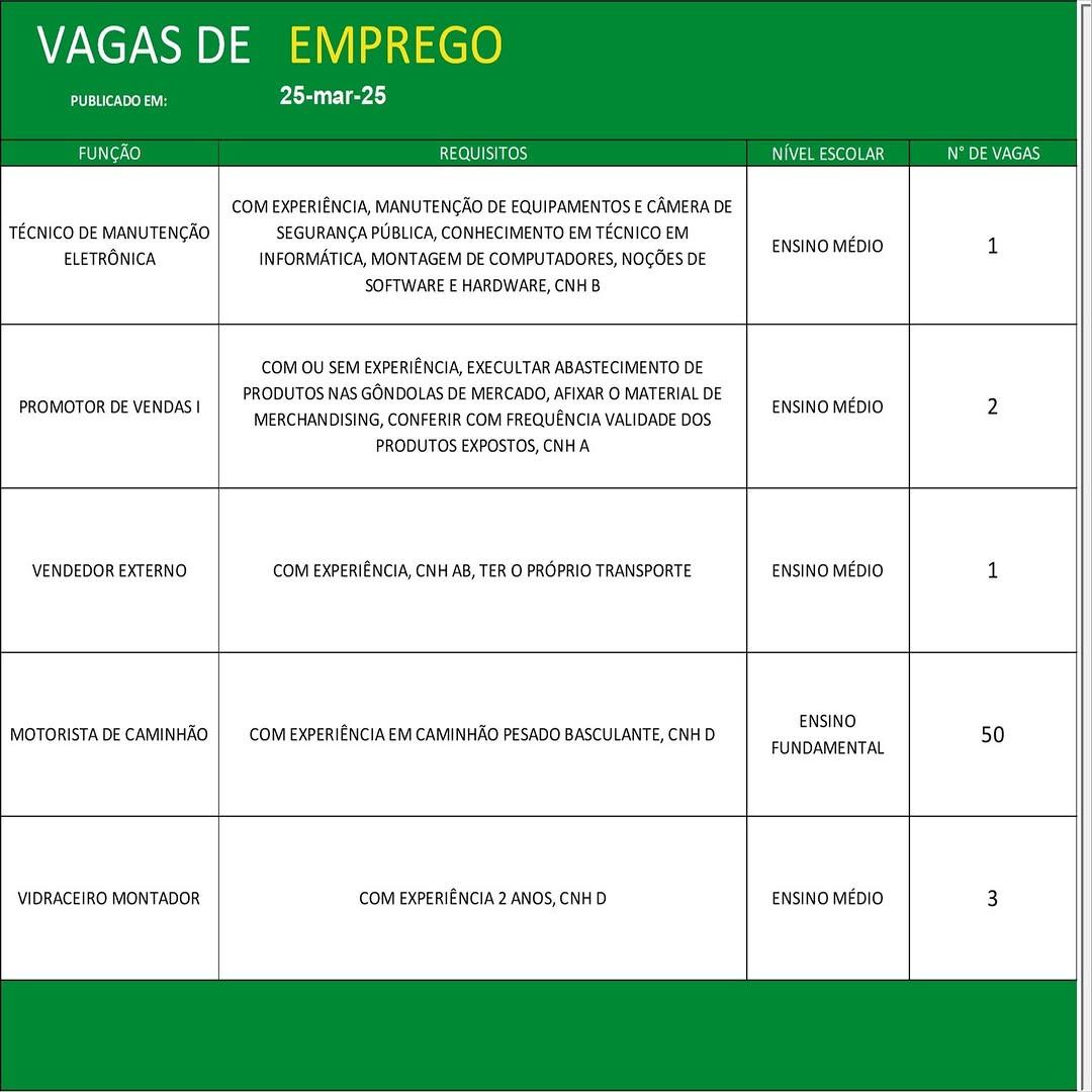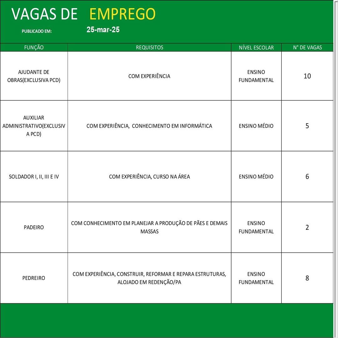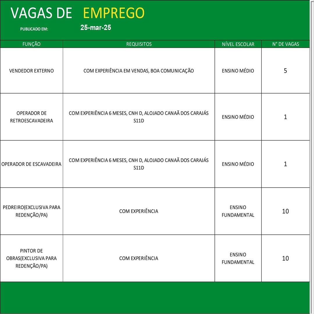 O Sine de Parauapebas divulgou as vagas em aberto nesta terça-feira (25). Os interessados devem apresentar currículo, RG, CPF, Carteira de Trabalho e comprovante de residência.