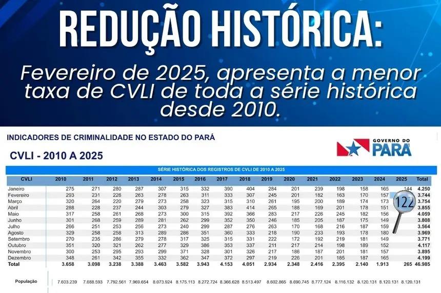 O governo do Estado, por meio da Polícia Militar e demais órgãos que compõem o Sistema de Segurança Pública, garantiu, pelo segundo mês consecutivo em 2025, uma redução histórica nos índices de violência contabilizados por meio dos Crimes Violentos Letais Intencionais (CVLI), que incluem homicídios, latrocínios e lesão corporal seguida de morte.