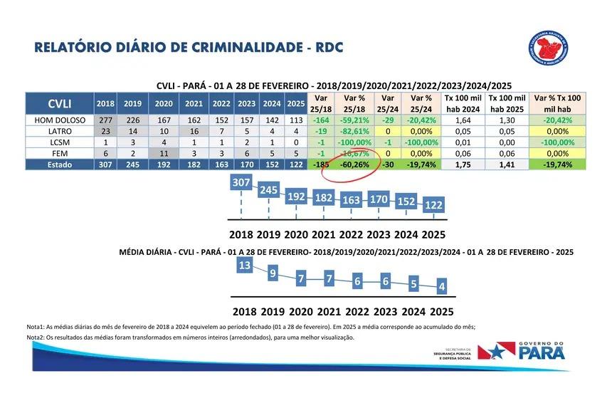 Fevereiro foi o melhor mês na redução do CVLI em toda a série histórica, contabilizada desde 2010. O estudo apresentado destaca que o comparativo entre 2018 e 2025 revela uma redução de 60,26%, o equivalente a 2.138 vidas preservadas no período.