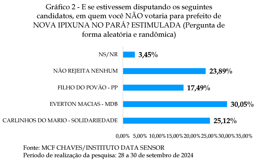 A pesquisa também aponta o grau de rejeição dos candidatos, com Everton sendo o mais rejeitado na disputa, por 30% dos entrevistados. Carlinhos é o segundo mais rejeitado, com 25,1%. Já o candidato a prefeito Filho do Povão aparece como o menos rejeitado na disputa, com 17,49%.