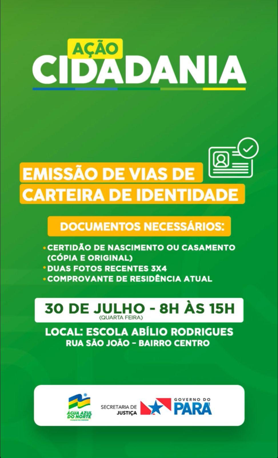 A Prefeitura de Água Azul do Norte, em parceria com o Governo do Pará e a Secretaria de Justiça, promove nesta quarta-feira (30) uma importante ação de cidadania no município: a emissão de carteiras de identidade, facilitando o acesso da população à documentação civil básica.