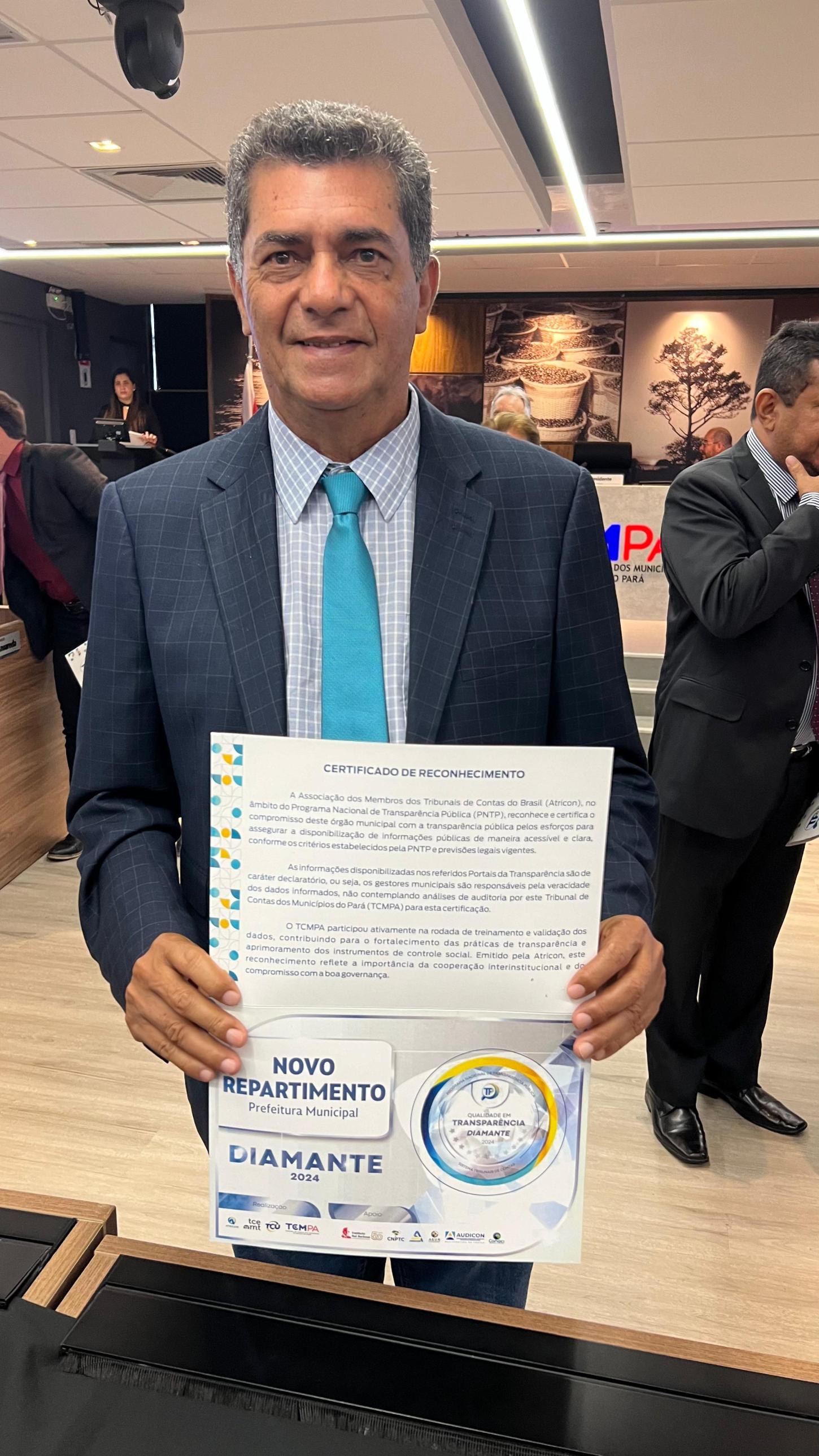Em cerimônia realizada nesta semana, o prefeito de Novo Repartimento, Valdir Lemes, recebeu o Selo Diamante em Transparência Pública, um dos mais aclamados e importantes reconhecimentos, que honra a excelência e a transparência na gestão pública.