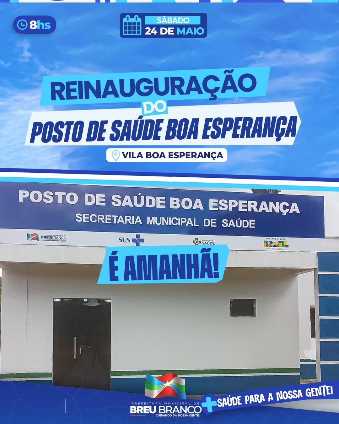 A Prefeitura Municipal de Breu Branco, por meio da Secretaria de Saúde, continua investindo na valorização da saúde básica e na melhoria da infraestrutura pública. Neste sábado, 24 de maio, às 8h da manhã, será reinaugurado o Posto de Saúde da Família da Vila Boa Esperança, uma importante unidade de atendimento que volta a funcionar totalmente revitalizada, pronta para oferecer mais conforto e qualidade à comunidade.