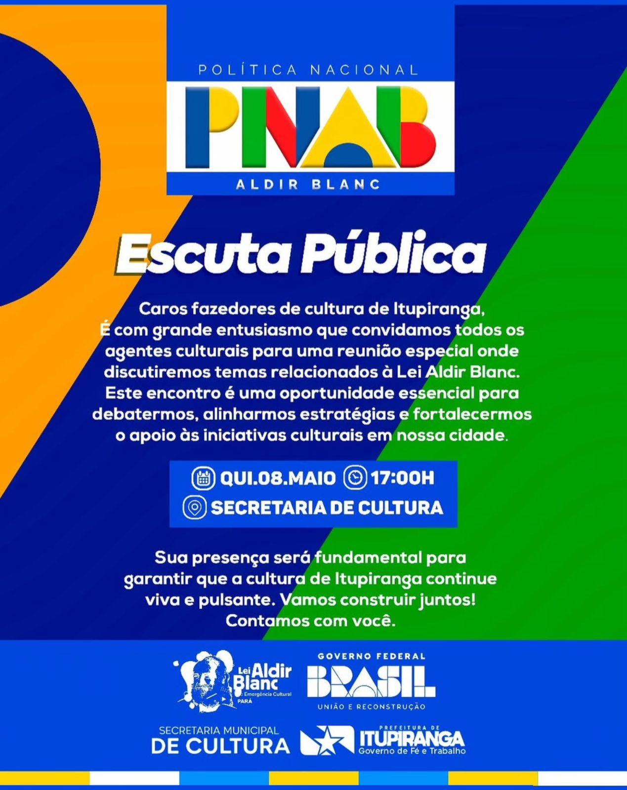 A Prefeitura Municipal de Itupiranga, por meio da Secretaria de Cultura, realizará uma escuta pública com os produtores culturais do município, com o objetivo de discutir e alinhar iniciativas culturais.