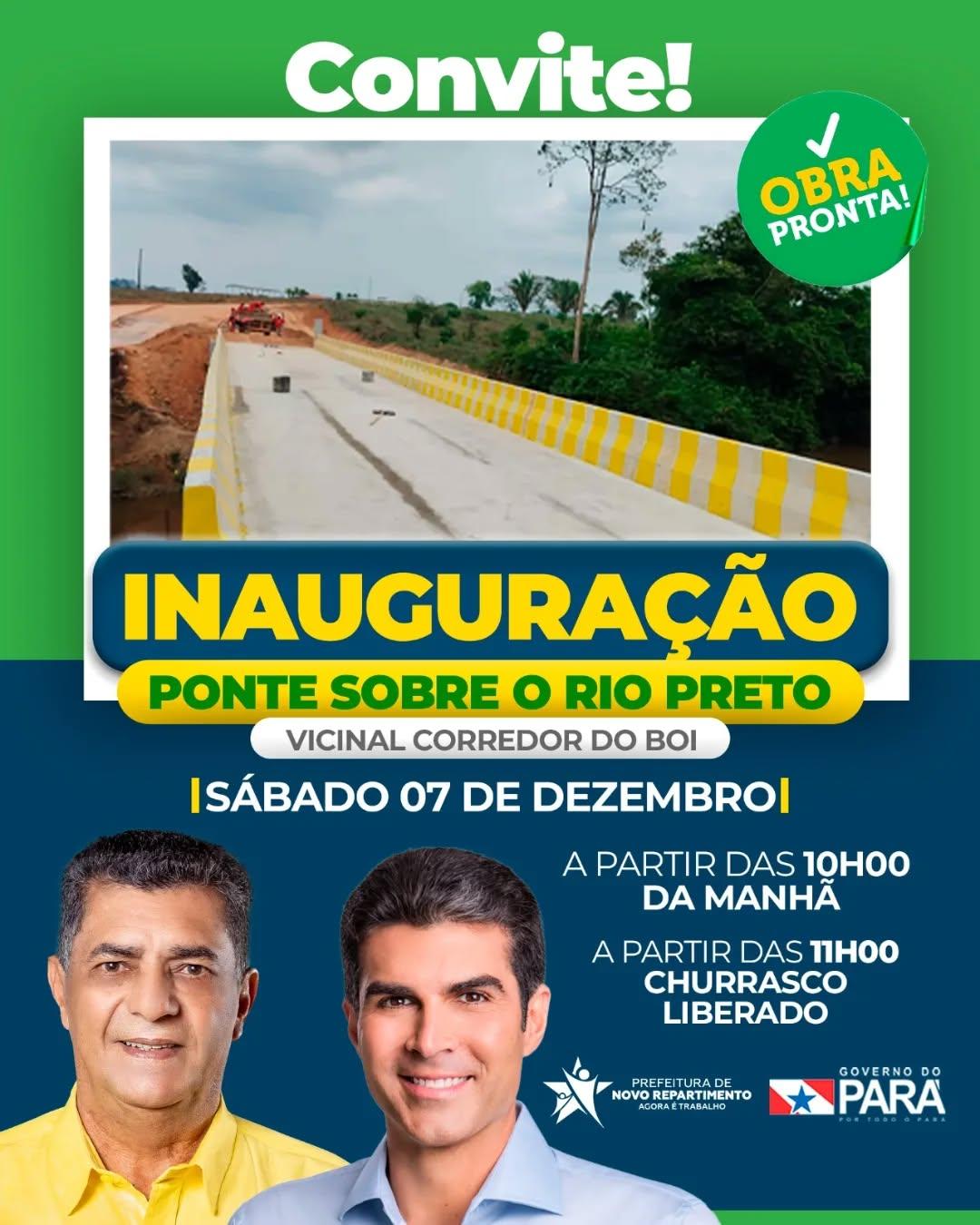A Prefeitura Municipal de Novo Repartimento, em parceria com o Governo do Estado do Pará, inaugura neste sábado (07), a nova ponte sobre o Rio Preto, na vicinal Corredor do Boi.