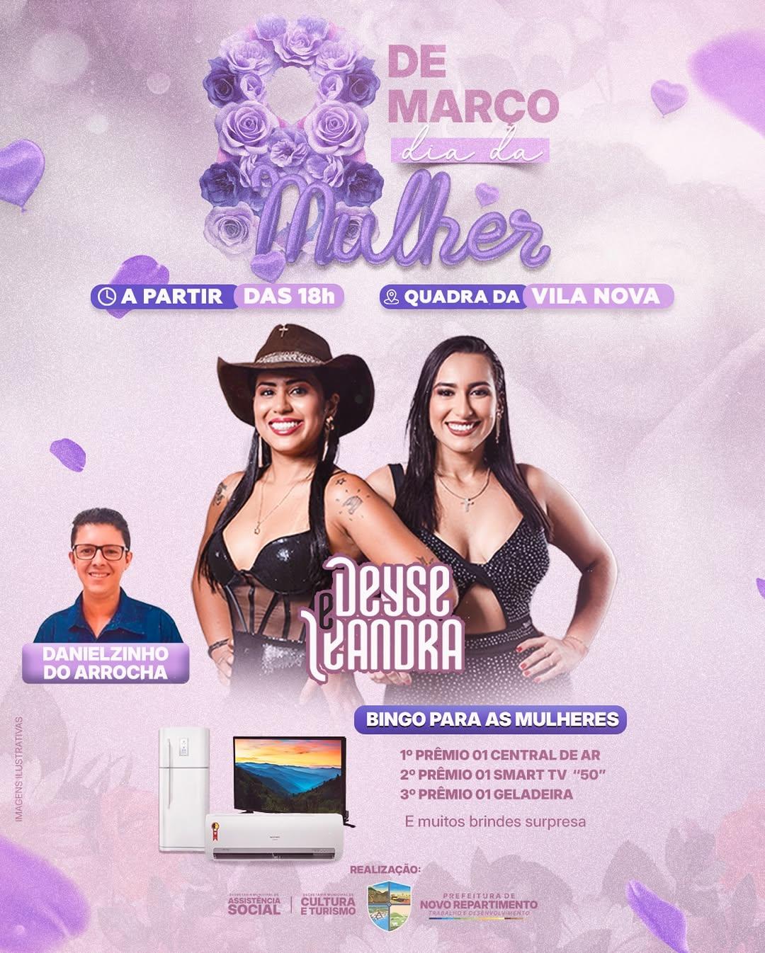 O evento acontece no sábado (8), na quadra da Vila Nova, e será aberto para todas as mulheres da comunidade. A programação começa a partir das 18h e terá shows da dupla Deyse e Leandra e também do Danielzinho do Arrocha. A celebração também vai contar com um bingo muito especial para as mulheres, valendo diversos prêmios.
