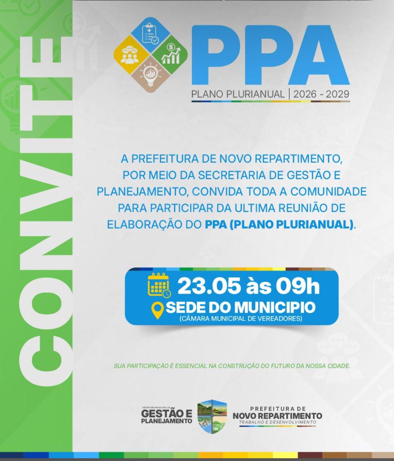 A Prefeitura de Novo Repartimento, por meio da Secretaria Municipal de Gestão e Planejamento, convida toda a população para participar da última reunião de elaboração do Plano Plurianual (PPA) 2026–2029, que será realizada na sexta-feira, 23 de maio, às 9h da manhã, na Câmara Municipal de Vereadores.