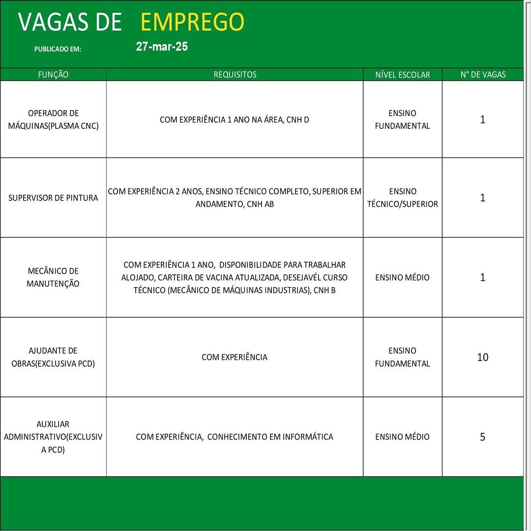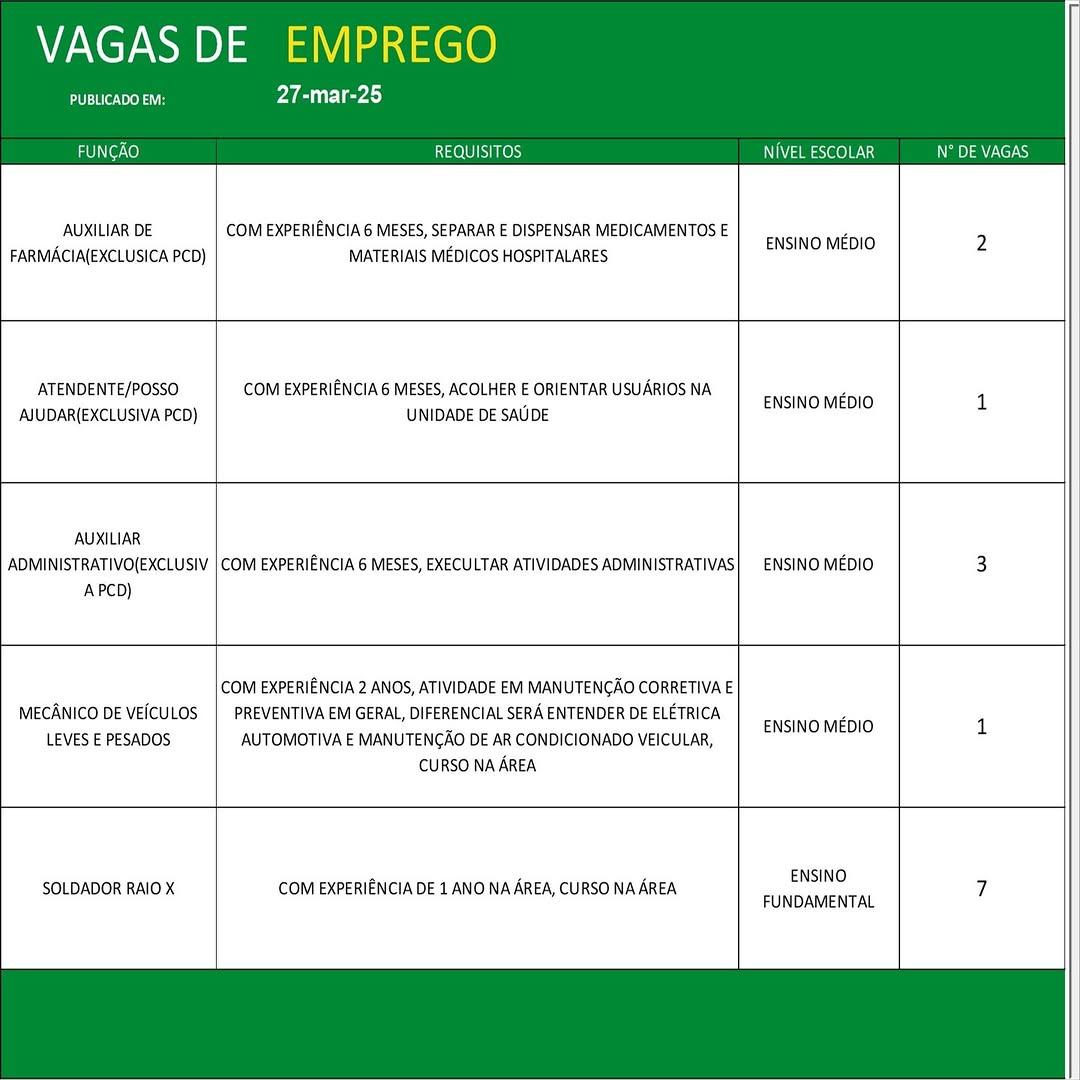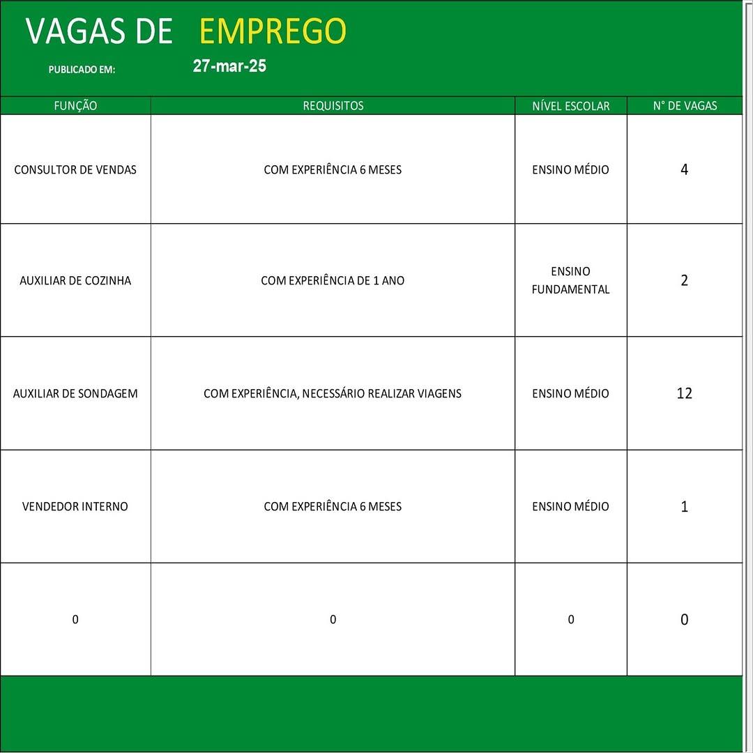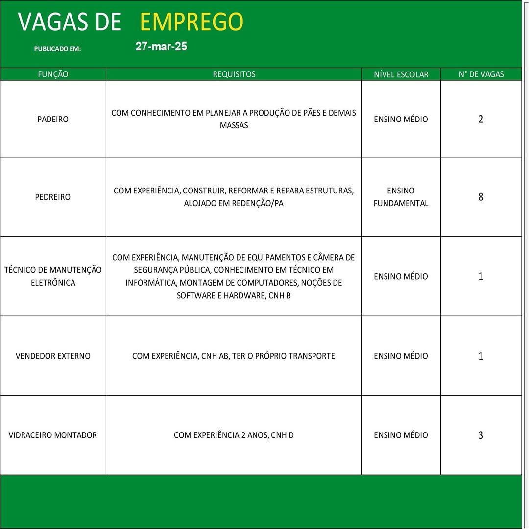 O Sine de Parauapebas divulgou as vagas em aberto nesta quinta-feira (27). Os interessados devem apresentar currículo, RG, CPF, Carteira de Trabalho e comprovante de residência.