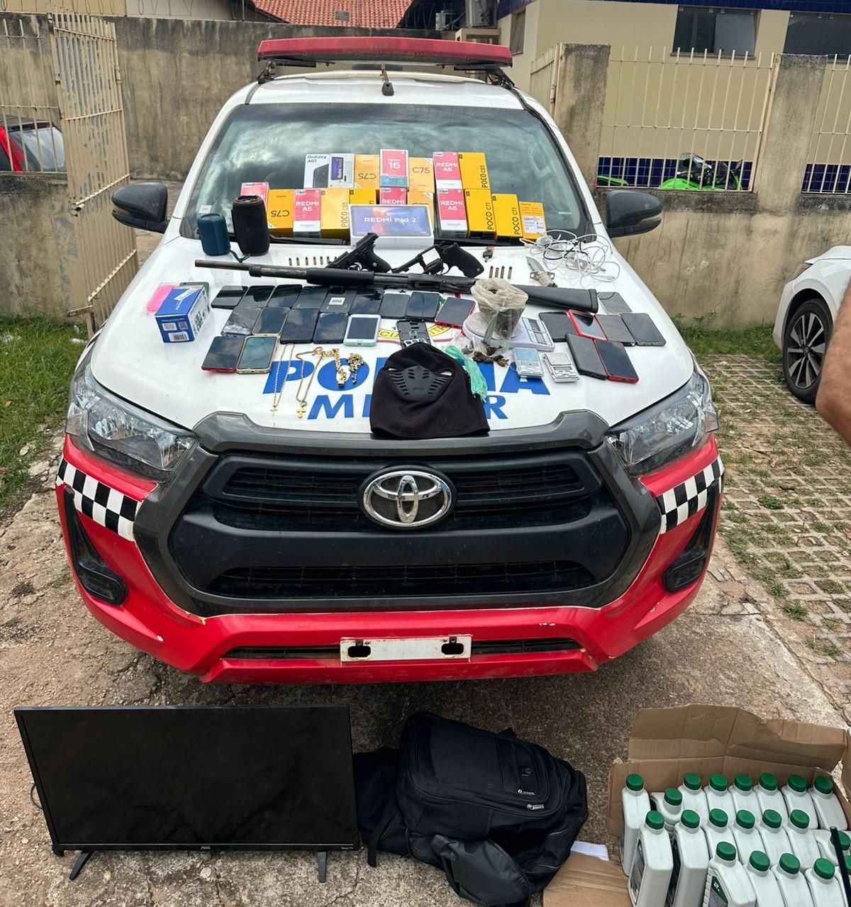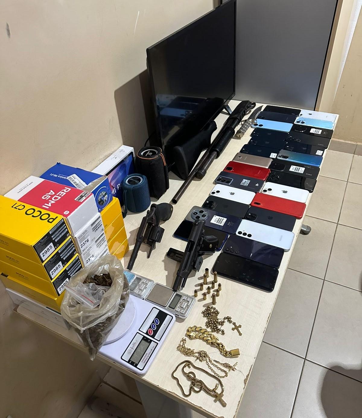 Também foram apreendidos 36 aparelhos celulares de diversas marcas e modelo, um tablet, três balanças de precisão, joias banhadas a ouro, uma televisão e 22 unidades de óleo lubrificante automotivo. O valor total dos materiais recuperados foi estimado em R$ 70 mil.
