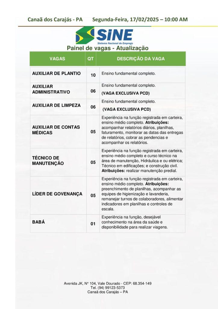 O Sine de Canaã dos Carajás divulgou as vagas em aberto nesta segunda-feira (17). Os interessados devem apresentar currículo, RG, CPF, Carteira de Trabalho e comprovante de residência. Para mais informações, ligue (94) 99123-5373.