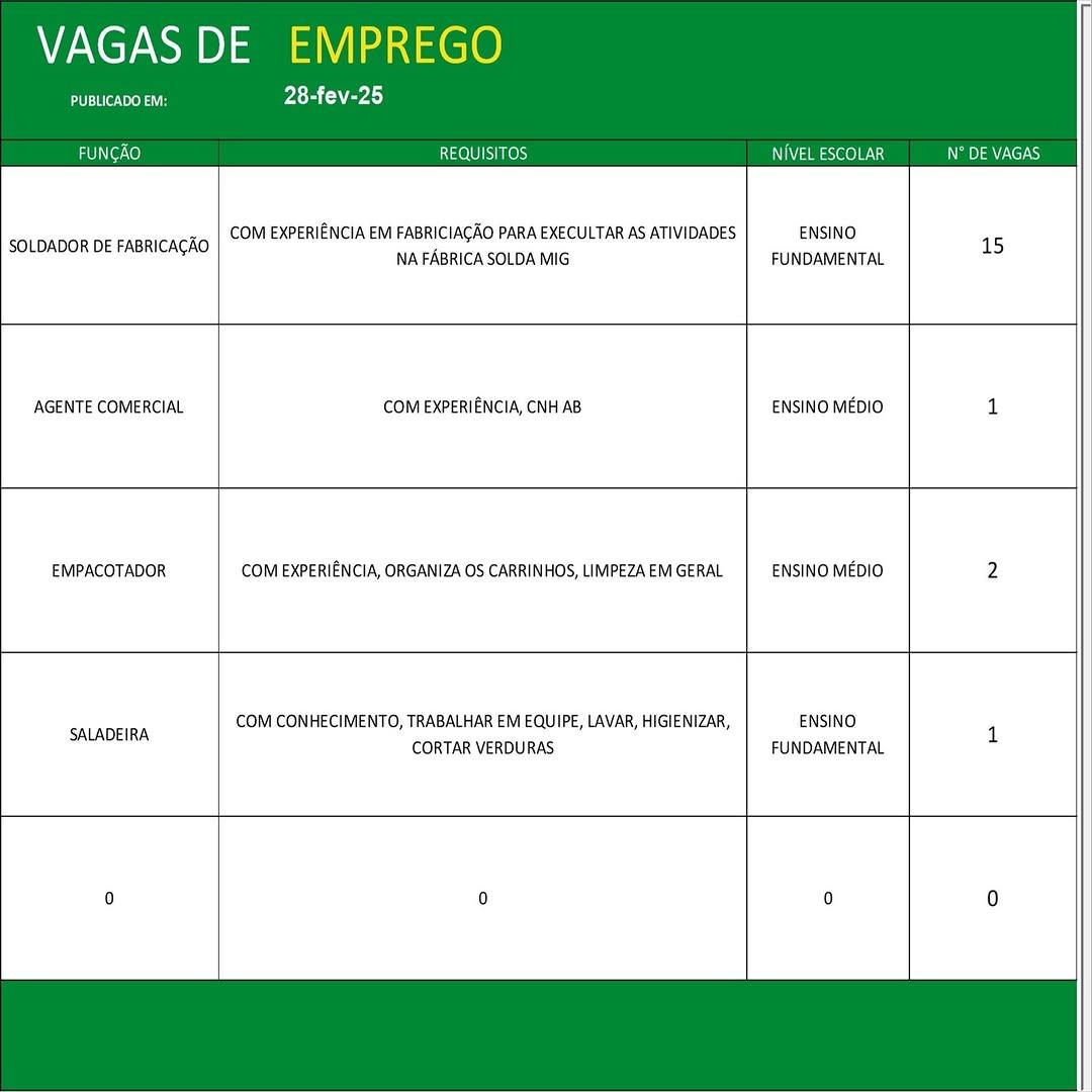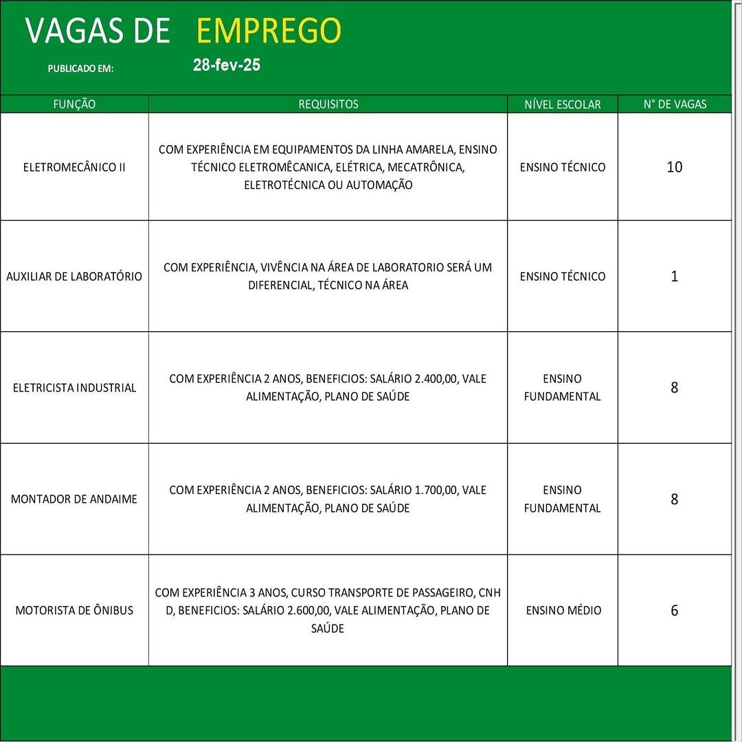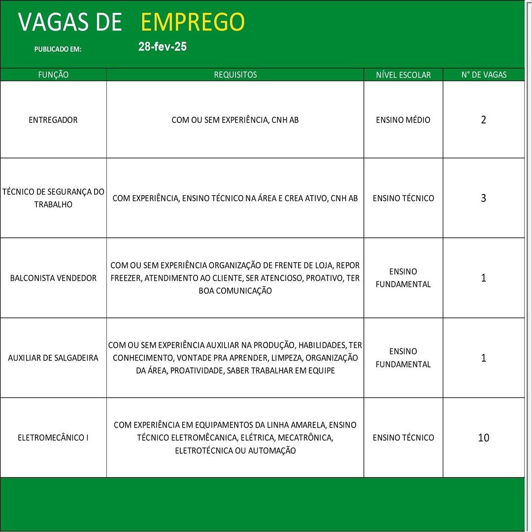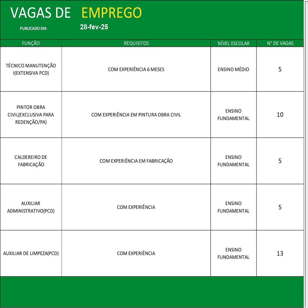 O Sine de Parauapebas divulgou as vagas em aberto nesta sexta-feira (28). Os interessados devem apresentar currículo, RG, CPF, Carteira de Trabalho e comprovante de residência.