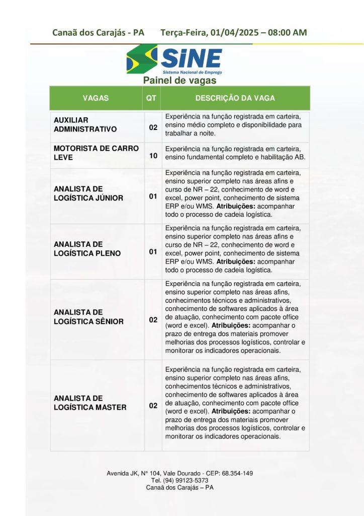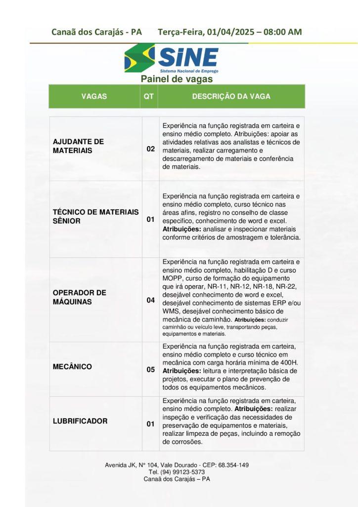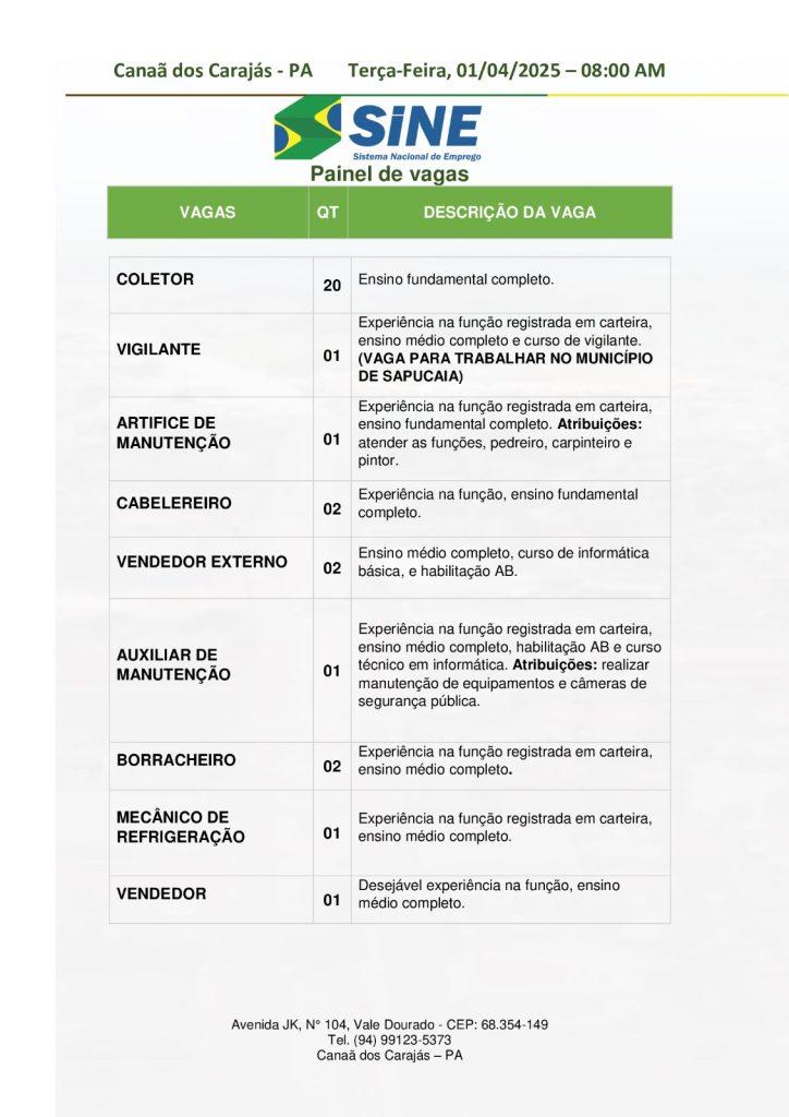 O Sine de Canaã dos Carajás divulgou as vagas em aberto nesta terça-feira (1). Os interessados devem apresentar currículo, RG, CPF, Carteira de Trabalho e comprovante de residência. Para mais informações, ligue (94) 99123-5373.