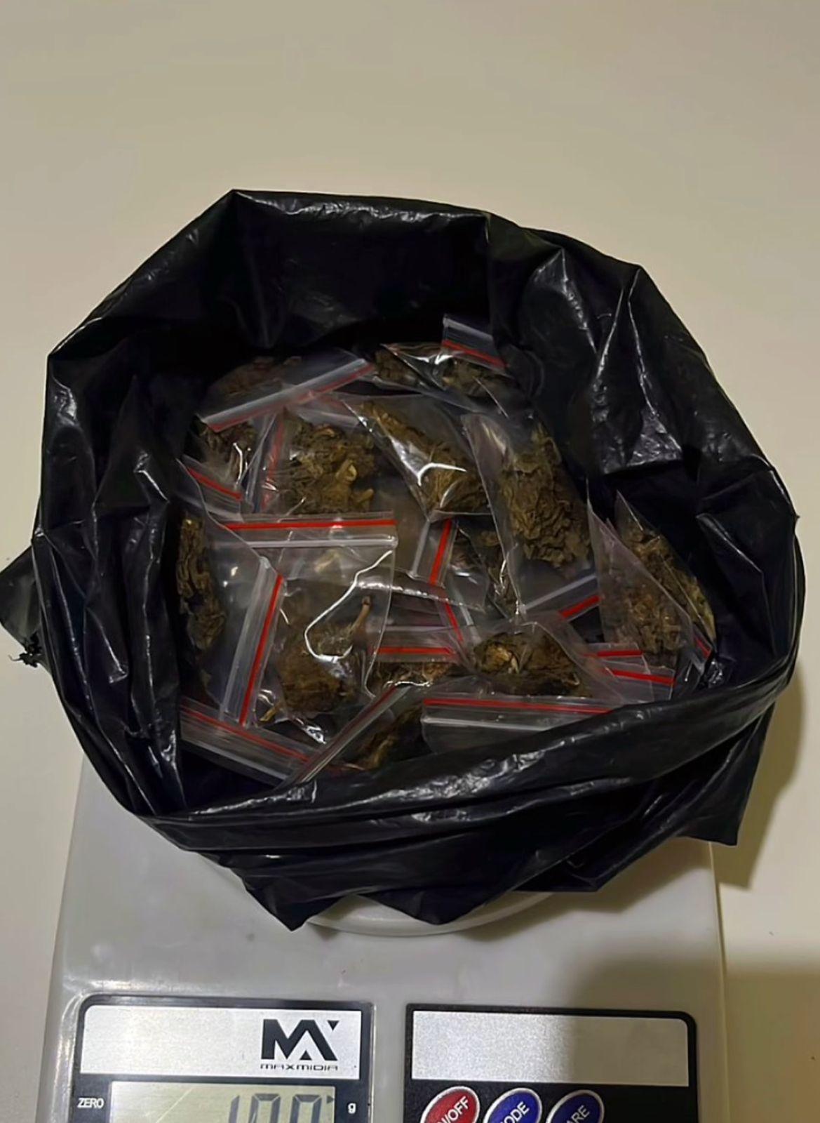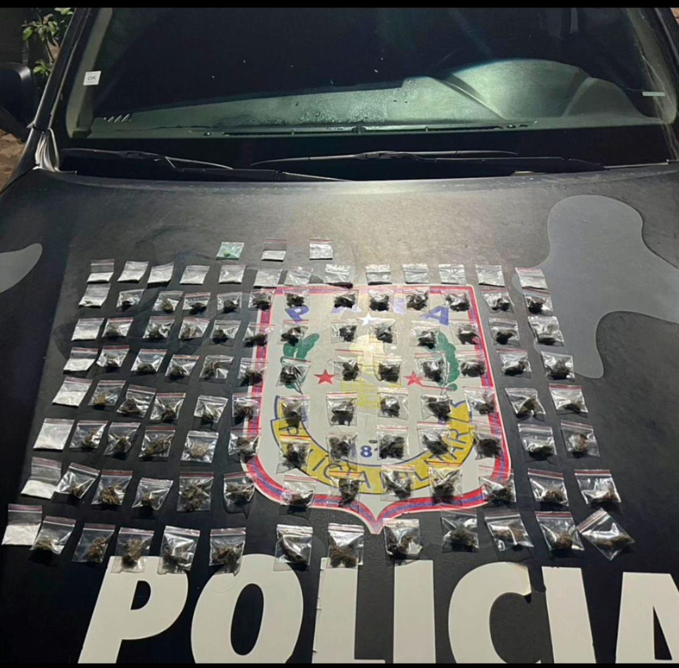 Durante a busca pessoal e a vistoria no imóvel, os militares encontraram quatro papelotes de maconha com o suspeito. No interior da casa, sobre um sofá, os policiais localizaram um pacote contendo 22 papelotes de cocaína, uma porção de ecstasy e 80 papelotes de maconha tipo “Colômbia”, além de outros materiais relacionados ao tráfico.